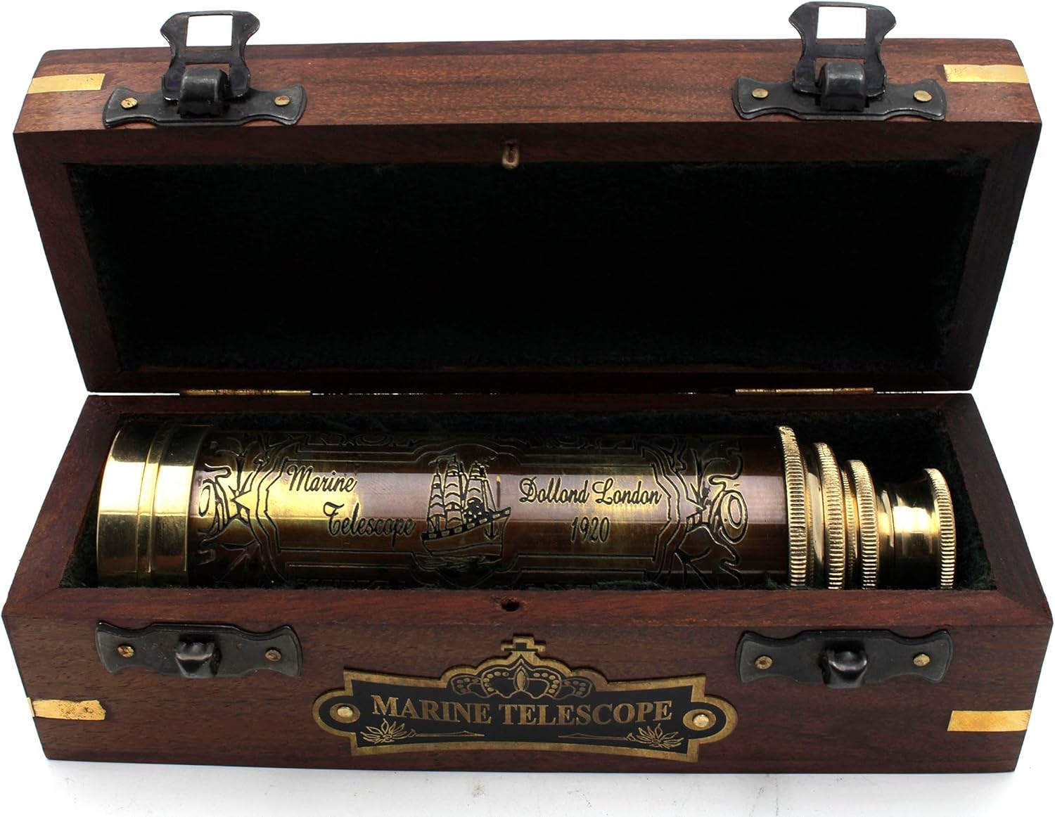 14" Handheld Brass Telescope with Engraved Imprints – Pirate Collection Spyglass with Wooden Box – Vintage Nautical Collectible, Antique Brass Pirate Scope Gift