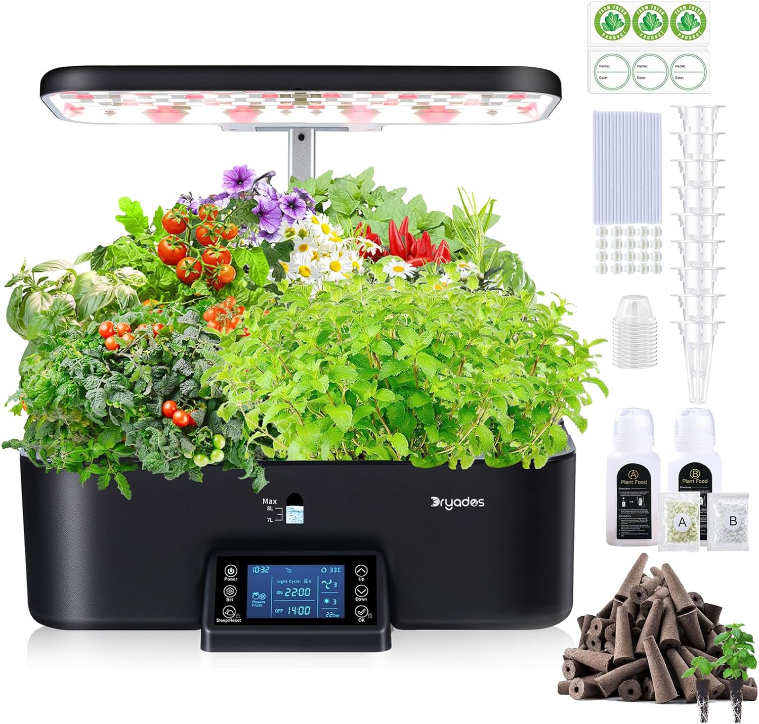 17-Pods Hydroponic Growing System with 24W Full-Spectrum Cooling Grow Light & Smart Control Panel for Indoor Gardening for Vegetables Herbs 111 pcs herb garden kit indoor with 800ml A&B nutrients (including 6 fertilizer refills), 36 grow sponges, 1 set bracket, 9 grow baskets, 10 grow domes, 33 shading sticker, 18 dome lables, cover all your need.