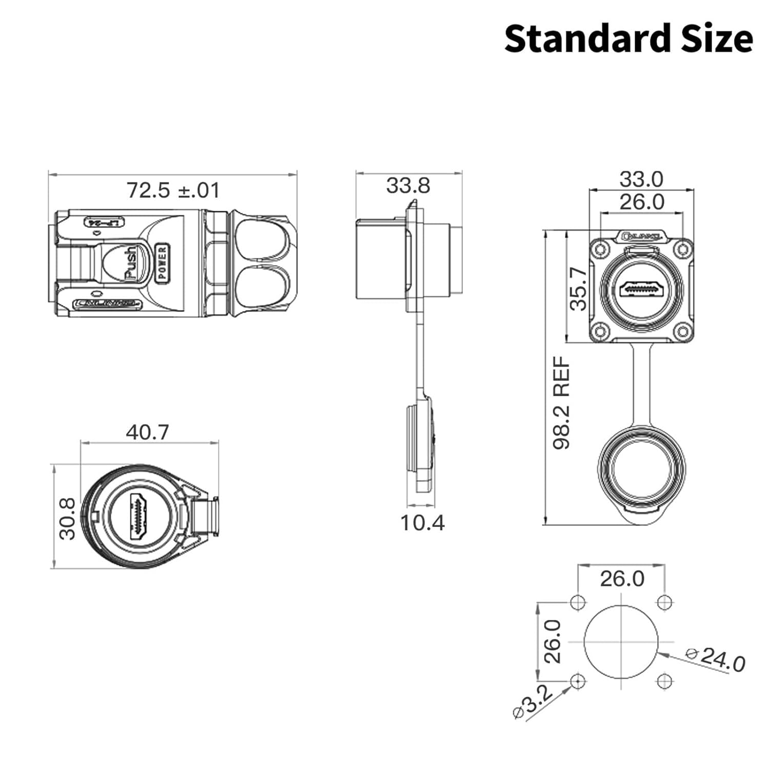 ConnectorsM24 HDMI2.0 Data Connector Waterproof HDMI-compatible 4 3840*2160 HD Transmission Adapter for Audio Video HDTV MonitorFeature:High-Speed Data TransferWith HDMI2.0 technology, enjoy high-speed data transfer for smooth video and audio transmission.Extension CableThe 1m and 2m extension cables offer flexibility in setup, allowing you to place your monitor or TV at a comfortable distance.4K HD ResolutionExperience crystal-clear visuals with the M24 HDMI2.0 cable, offering 4K HD resolution for an immersive viewing experience.HDMI-CompatibleThis adapter seamlessly connects to HDMI-compatible devices, providing a versatile solution for your audio and video needs.Waterproof DesignThe waterproof design ensures reliable performance even in wet conditions, making it perfect for outdoor use or humid environments.==========Hign-concerned Chemical : NoneModel Number : LP24-HDMIColor : BlackApproved : UL & TUVProtection Level : IP68Durability(Min.) : 500 timesFlammability rating : UL94-V0Housing&insulation parts : High-performance engineering plasticsConnecting mode : Easy locking typeShell&insulated parts : PBT PlasticHardware metal : Zinc alloyRated current : 0.5ARated voltage : 5V ACContact resistance(Max.) : 30mInsulation resistance(Min.) : 100MCable length : with 1m/2m/3m/5m