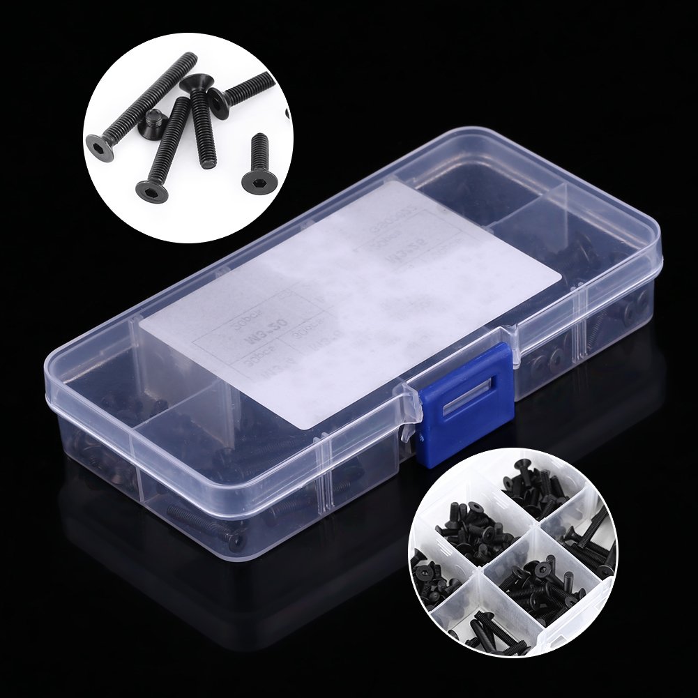 Product description Specifications: Material: 10.9 Grade Alloy Steel Color: Black Thread Lengths: 4mm(30Pcs), 6mm(30Pcs), 8mm(30Pcs), 10mm(30Pcs), 12mm(20Pcs), 16mm(20Pcs), 20mm(20Pcs), 25mm(20Pcs) Thread Diameter: 3mm (M3) Box Size: 13 * 6.5 * 2.3cm / 5 * 2.6 * 0.9inch Quantity: 1 x Box of 200Pcs Screws Package Weight: 138g Type: Flat Head Hex Socket Screw Function: Fastener Package Includes: 1 x Box of 200Pcs Screws Manufacturer Contact Information 1
