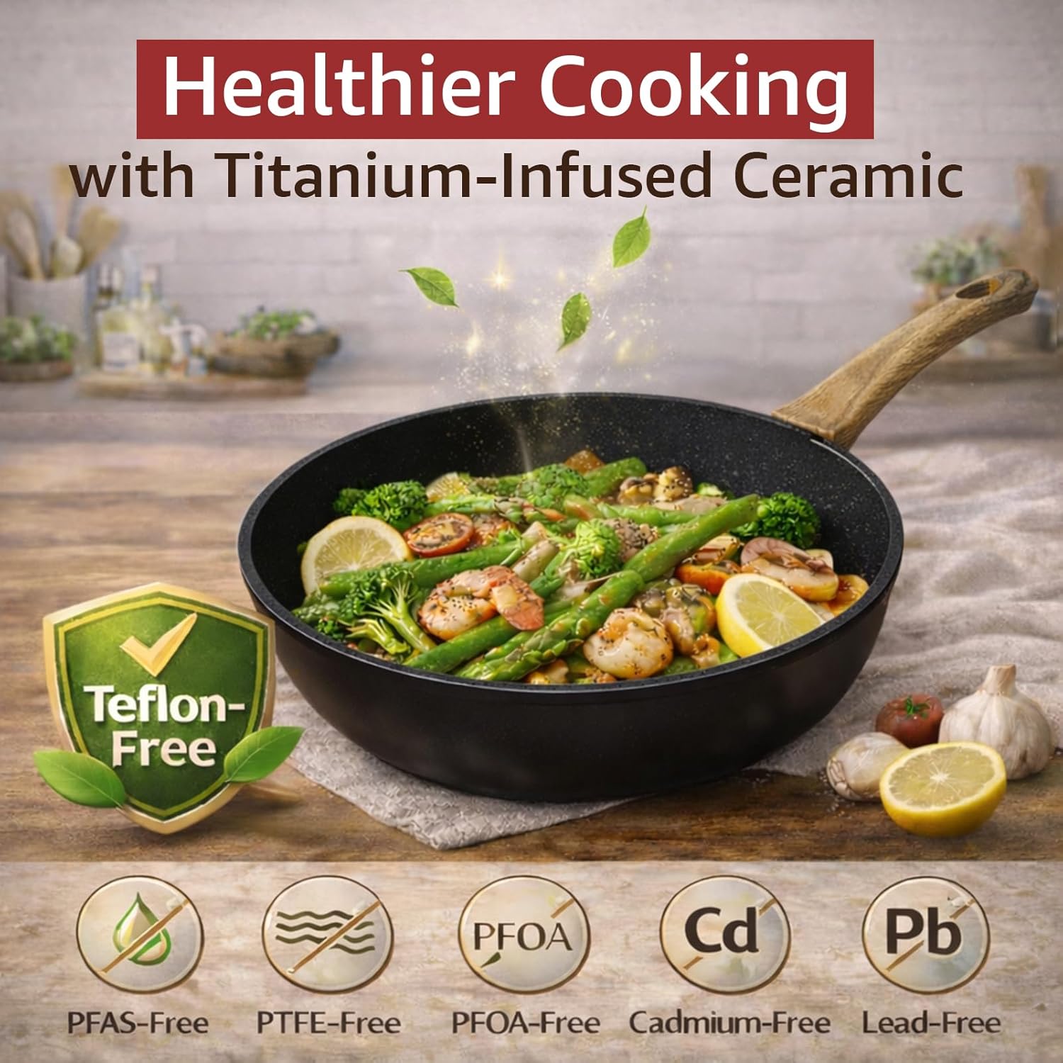 | Included Components | 2.6Qt (8") sauce pan,8“&9.5"&11" frying pan, 3.6Qt(11") saute pan, 11" grill pan, 4Qt(9.5")&6.8Qt(11") casserole pot, 4 utensils and 8" steamer, 6 protection pads |