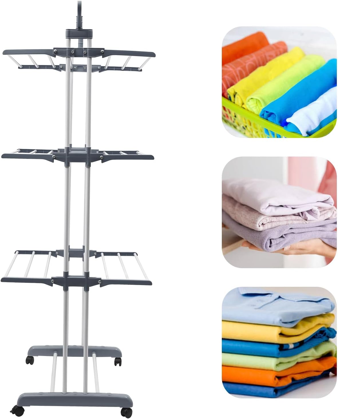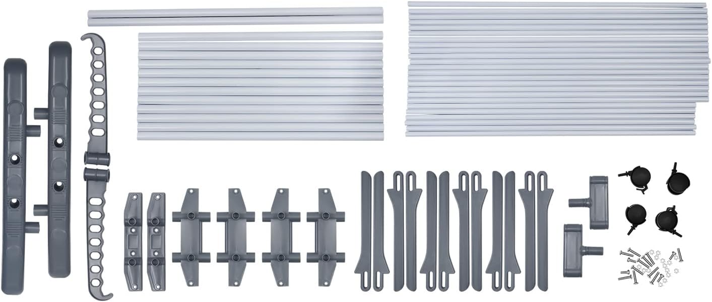 Details2 Side Wings: The two 360° rotatable side wings with 7 windproof hook holes can be used to hang clothes, backpacks, or umbrellas, providing your clothes with a nice amount of space to dry.Bottom Rack: You can place shoes, shoe boxes, bags, etc. on the bottom rack. Its hollow design ensures good ventilation without accumulating water.Rolling Wheels: The 4 universal wheels (two of them with brakes) on the bases allow for easy movement and safe fixation.ApplicationThe drying rack is suitable for indoor or outdoor use. It can be placed in bedrooms, lofts, balconies, patios, hallways, bathrooms, and so on to hang, dry, and store. SpecificationsColor: GrayMaterial: MetalStyle: ModernShape: RectangularMounting Type: Floor MountFeature: Foldable, MovableAssembly Required: YesRecommended Uses for Product: StorageNumber of Tiers: 4Gross Weight: 3.5kg/7.7lbsWidth after Expansion: 64cm/25.2inchProduct Size: 76*50*172cm/29.92*19.69*67.72inchPackage Size: 80*12*20cm/31.5*4.7*7.8inchPackage Included1* Drying Rack4* Wheels2* Base SupportsOther Accessories for Assembly.Notes1. Please do not place it in direct sunshine or rain for a long time to extend its service life. 2. Please take the tubes out of the package to ensure they are organized for assembly by length.
