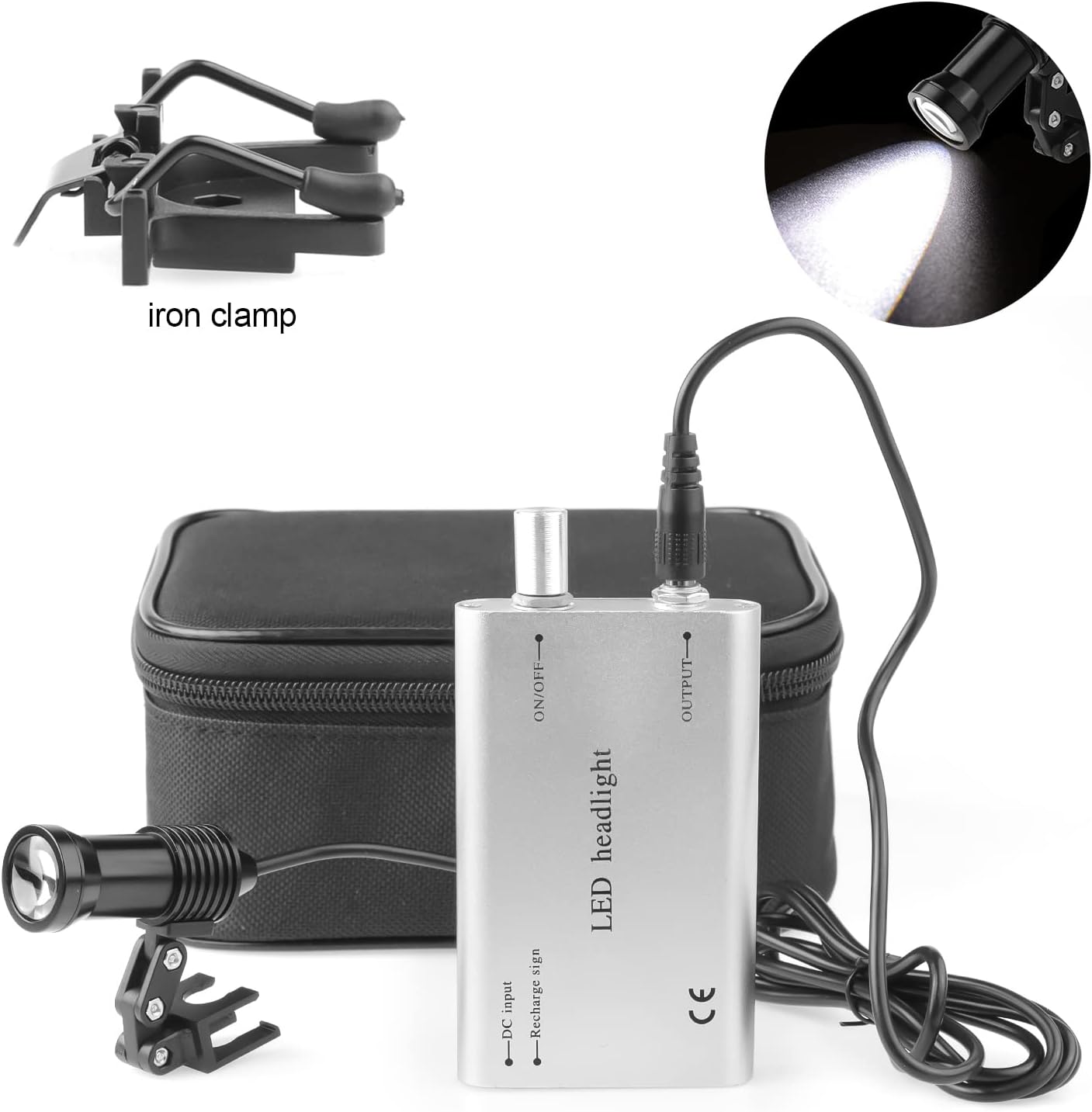 Specifications: Model: DY-009 High Intensity: 15000-30000Lux The Power of the LED Bulb: 5W Input Voltage: AC100-240V / 50-60HZ Life Time of Bulb: 10000 hours Continous Work Time: after full charge 5 hours Light Spot Shape: Clear Circle Material: Plastic Color fo choose: Black, Blue, Red, Silver Weight: 0.34 kg Package size: 19.5*10.5*13.5 cm Package Included: 1x Headlight with insert clip 1x Metal clip 1x Power adapter (recharger) 1x Battery 1x Filter 1x Cloth Bag