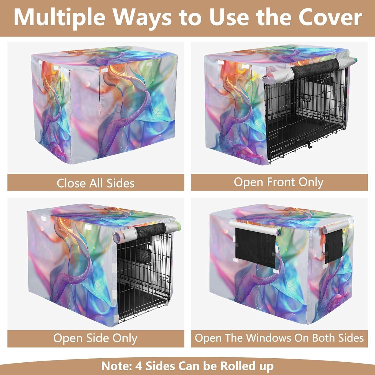 Premium Protection – Constructed from 600D silver-coated oxford fabric, this pet crate cover offers excellent protection from rain, wind, and sunlight. It helps prevent scratching and keeps your pet’s crate protected from external elements.Quick Setup – This travel dog crate cover is designed for easy installation, with a simple fastening system that ensures a secure fit without the need for tools or extra help.Mesh Windows for Comfort – This crate cover includes mesh windows on all sides, promoting airflow to keep your dog cool and comfortable while providing privacy and a sense of security inside the crate.Secure and Stable – With four tie-down straps at the bottom, this travel crate cover remains securely in place, even during windy conditions. This feature ensures that your dog’s crate is stable and protected from the elements.Flexible Usage – This breathable dog crate cover is suitable for both indoor and outdoor use, making it a Suitable solution for protecting your pet's crate whether at home, during travel, or on outdoor adventures.