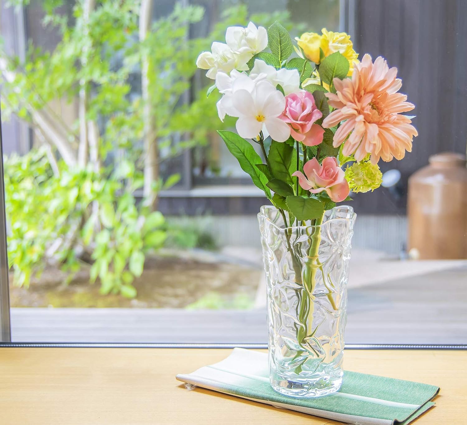 Soft glass vase with large flowers. Elegant form and recommended as a gift.