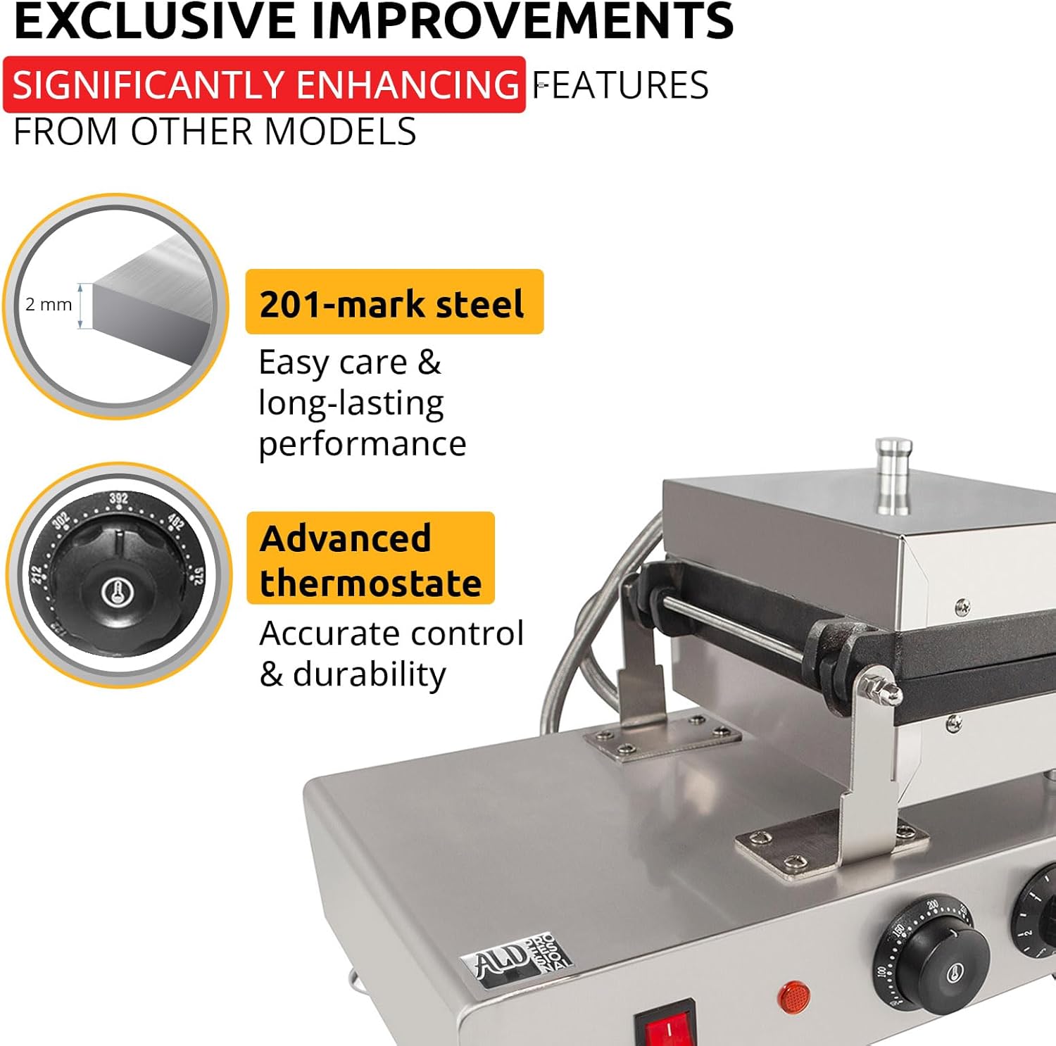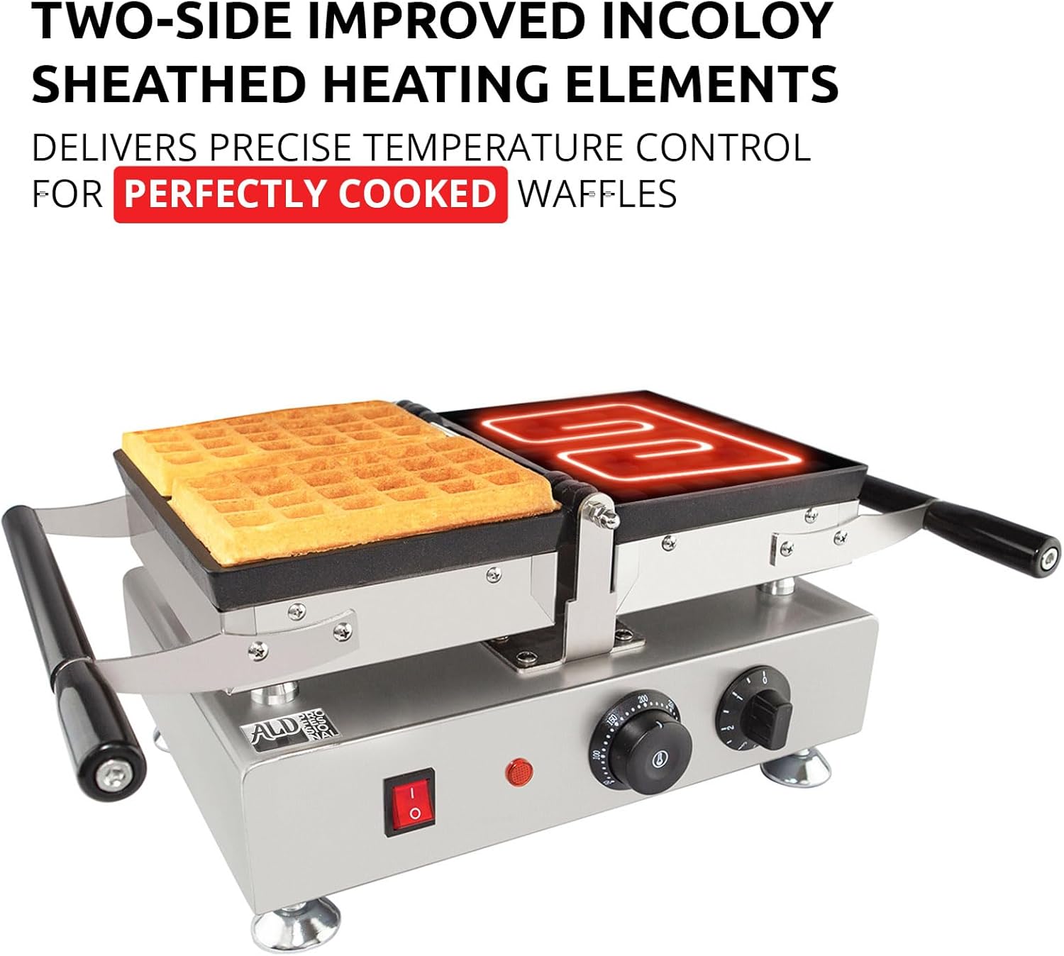 This machine is made of stainless steel and destined to prepare two deliciously crunchy and soft waffles with deep, wide wells fast and easy. Due to its heavy-duty commercial built, the device can withstand extensive use in bars, restaurants, hotels, and fast food spots.