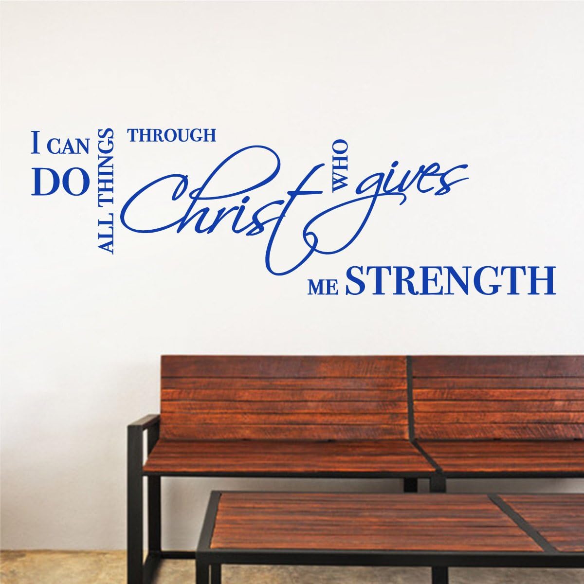 I Can Do All Things Bible Quote Wall Decal is a great decal to make any wall in your home look great. Every order comes with simple instructions and an application squeegee. It is fully removable and leaves no residue when removed. There are multiple color and size options so choose the one that best suits your rooms decor. It has a matte finish and has a painted on appearance when fully applied. Every decal is made once you order it and takes about 48 hours to ship. Also, check out our website for application videos.