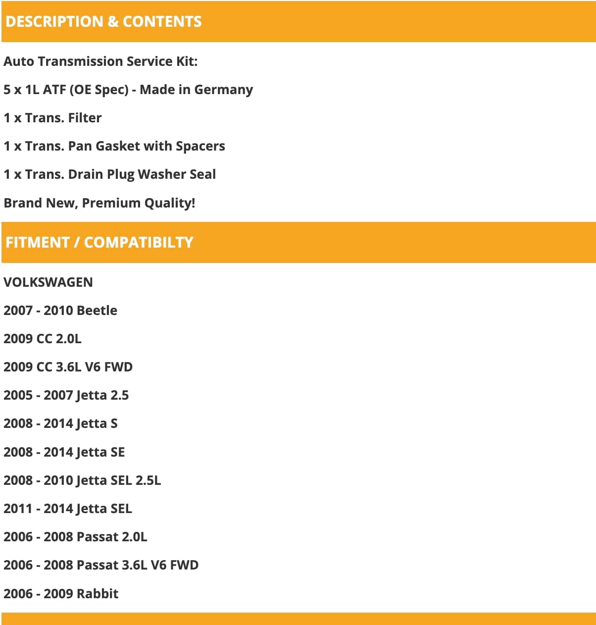 Auto Transmission Service Kit: 5 x 1L ATF (OE Spec) - Made in Germany 1 x Trans. Filter 1 x Trans. Pan Gasket with Spacers 1 x Trans. Drain Plug Washer Seal Brand New, Premium Quality! Compatible with VOLKSWAGEN 2007 - 2010 Beetle 2009 CC 2.0L 2009 CC 3.6L V6 FWD 2005 - 2007 Jetta 2.5 2008 - 2014 Jetta S 2008 - 2014 Jetta SE 2008 - 2010 Jetta SEL 2.5L 2011 - 2014 Jetta SEL 2006 - 2008 Passat 2.0L 2006 - 2008 Passat 3.6L V6 FWD 2006 - 2009 Rabbit