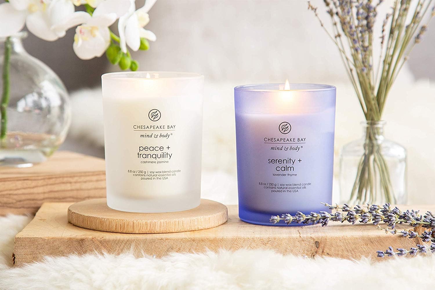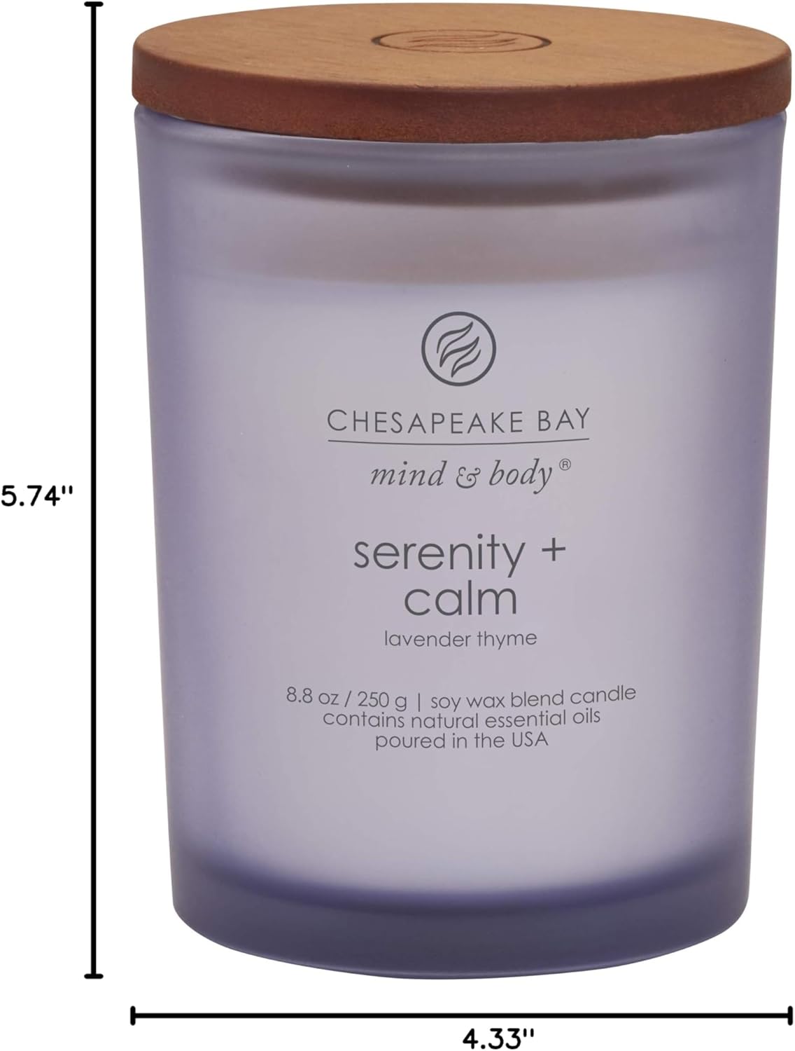 The Chesapeake Bay Candle mind & body collection Medium glass jar candle is a fragrance filled journey into wellness for the mind & body. Sleep and Calm create a serene environment thanks to the calming and balancing benefits of lavender. Enhanced with Essential oils of Bergamot, rosemary, thyme and eucalyptus, this fragrance diffuses a fresh scent along with touches of orange Blossom, allowing you to relax your body and quiet your mind. Includes Essential oils of: rosemary, eucalyptus, camphor, lavender, lavandin, cedar wood, fir needle, fir balsam, orange, patchouli, Bergamot, thyme. Peace and tranquility fresh clean and airy notes of lily of the Valley and Bergamot do not betray the relaxing nature of this fragrant aroma. Escape into the comforting arms of exotic Jasmine, cotton Blossom and rose as they soften the atmosphere. This peaceful floral combination pleasantly rests of delicate cashmere woods, white musk and sandalwood. Includes Essential oils of: Yang, lemon, cedar wood. When finding time has become a luxury, one needs to Pause and look inward to redefine inner Peace and inspire others. Allow moments of Stillness and the simple pleasures of fragrance to take you on a journey for the mind and body. Just as ripples expand across the water of a pond, our flow of emotions fluctuates from core energy to absolute Stillness. Let Chesapeake Bay Candle take you on a sensory journey. . .