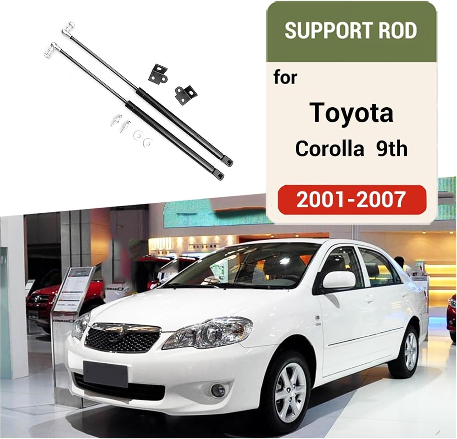 Car Compatible With Toyota Corolla/Allex;2000-2007 9th; E120/E1302pcs/rod with accessoriesInstall position: Bonnet CoverEasy install.Noting: Only Compatible With 9th;2000-2007 model; Placement on Vehicle : FrontCountry/Region of Manufacture : China Special Features : SupportItem Weight : 0.8Item Height : 1Item Width : 1Item Length : 1 Origin : Mainland ChinaMaterial : Stainless Steel