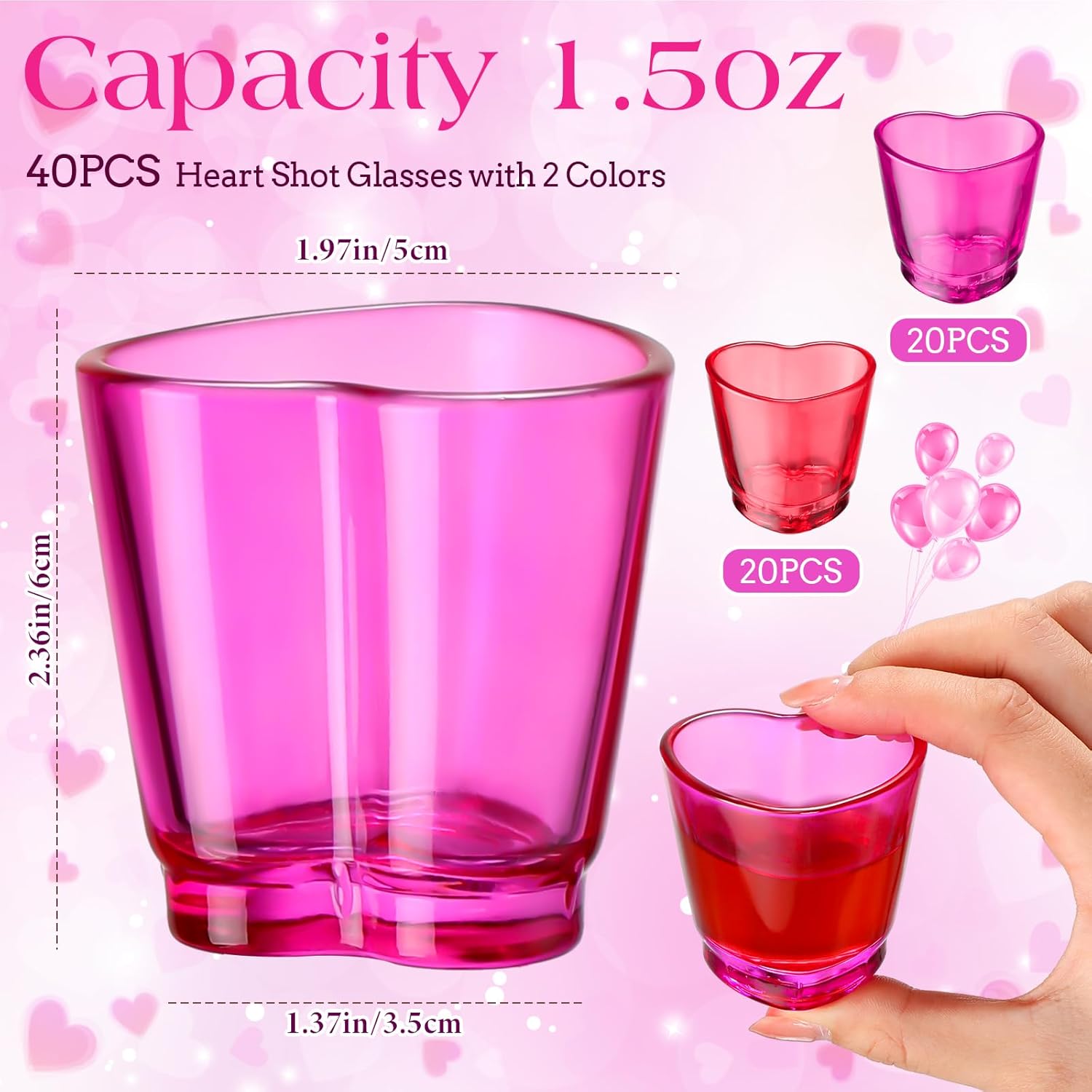 Features: Heart shot glasses make a thoughtful and ideal present for a loved one on Valentine's Day. It's an extraordinary way to express your love. Our heart shaped shot glasses set contributes to creating a romantic atmosphere and can be applied not only for drinking, but also as beautiful table decorations, Specifications: Material: glassColor: as pictures show Capacity: 1.5 ozPackage includes: 40 x Heart shot glasses setNotes: Manual measurement, please allow slight errors on size. The color may exist a slight difference due to different screen displays.