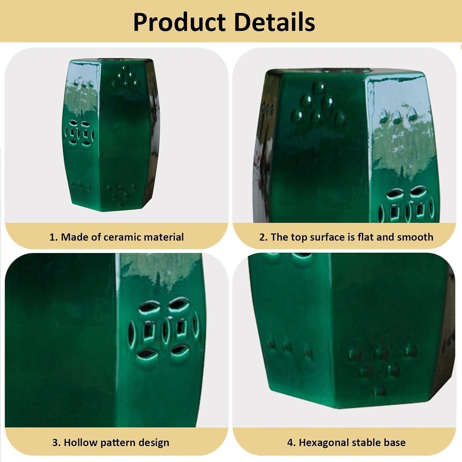Product Name:Ceramic stoolProduct material: CeramicProduct color: Green, Dark blueSize: 28x50cm/11x19.7inPlace of origin: ChinaPacking list:1x Porcelain drum stoolPrecautions:1. During the production process, there will be small black spots and pinholes, which is normal. Perfectors please note.2. Do not use wire balls or hard objects to clean, it is normal to produce s scratches.3. Due to different monitors and ing effects, the actual color of the product may be sly different from the color on the picture.4. Due to manual measurement, please allow a measurement deviation of 1-3 cm.
