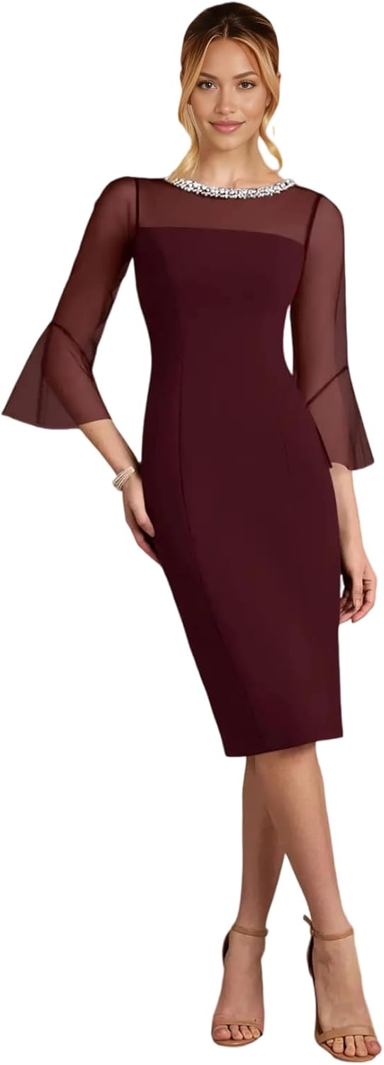Elegant Sheer Sleeve Bodycon Mother of The Bride Dress Rhinestone Illusion Neckline Cocktail Dress Wedding Guest Dresses