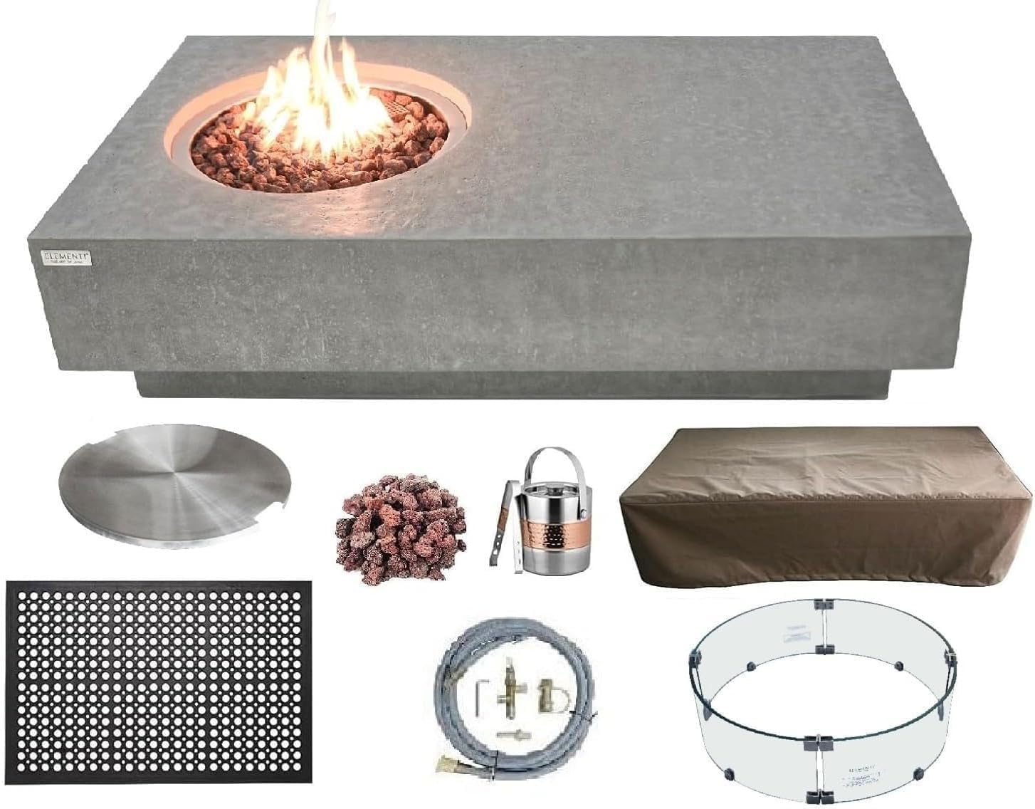 Designed for Natural Gas only. Amazing high quality 45,000 BTU propane fire pit table with auto-ignition makes sure a clean and smokeless flame. Perfect for the backyard, patio, deck, poolside, or other outdoor living space. Includes pre-attached 10 ft. hose with regulator, type 304 stainless steel burner and burn pan. Also includes lava rock (41 value). The lightweight glass-fiber reinforced concrete fire table compliments other patio furniture and accessories to offer a unified outdoor living space. The size is L 56.0" x W 32.0" x H 14.0" Enjoy approximately 10-12 hours of burn time on a full standard 20 lb. (5 gallons) propane tank, dependent on the setting of the flame height. Admire the dancing flames on the lava rock while keeping cozy within the heating radius of this impressive Elementi outdoor fire pit. Relaxing and entertaining outdoor life with family and friends all year round with Elementi Fire Table / Fire Pit. CSA approved propane fire table / fire pit is safe to use during most fire bans and offers easy lighting and flame height adjustments. One Year Manufacturer's Limited Warranty.