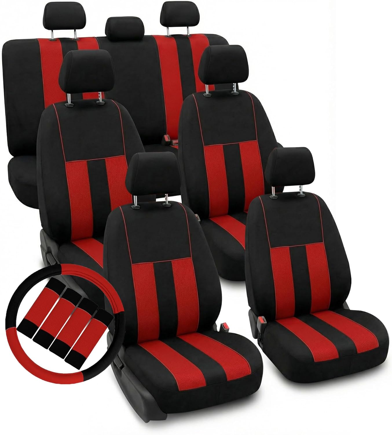 | Included Components | 4 front low back bucket covers, 1 rear backrest cover, 1 rear bottom bench cover, 1 set of mesh pieces, 7 headrests covers, 1 Steering wheel cover, 4 seatbelt pads and Hardware to Install |