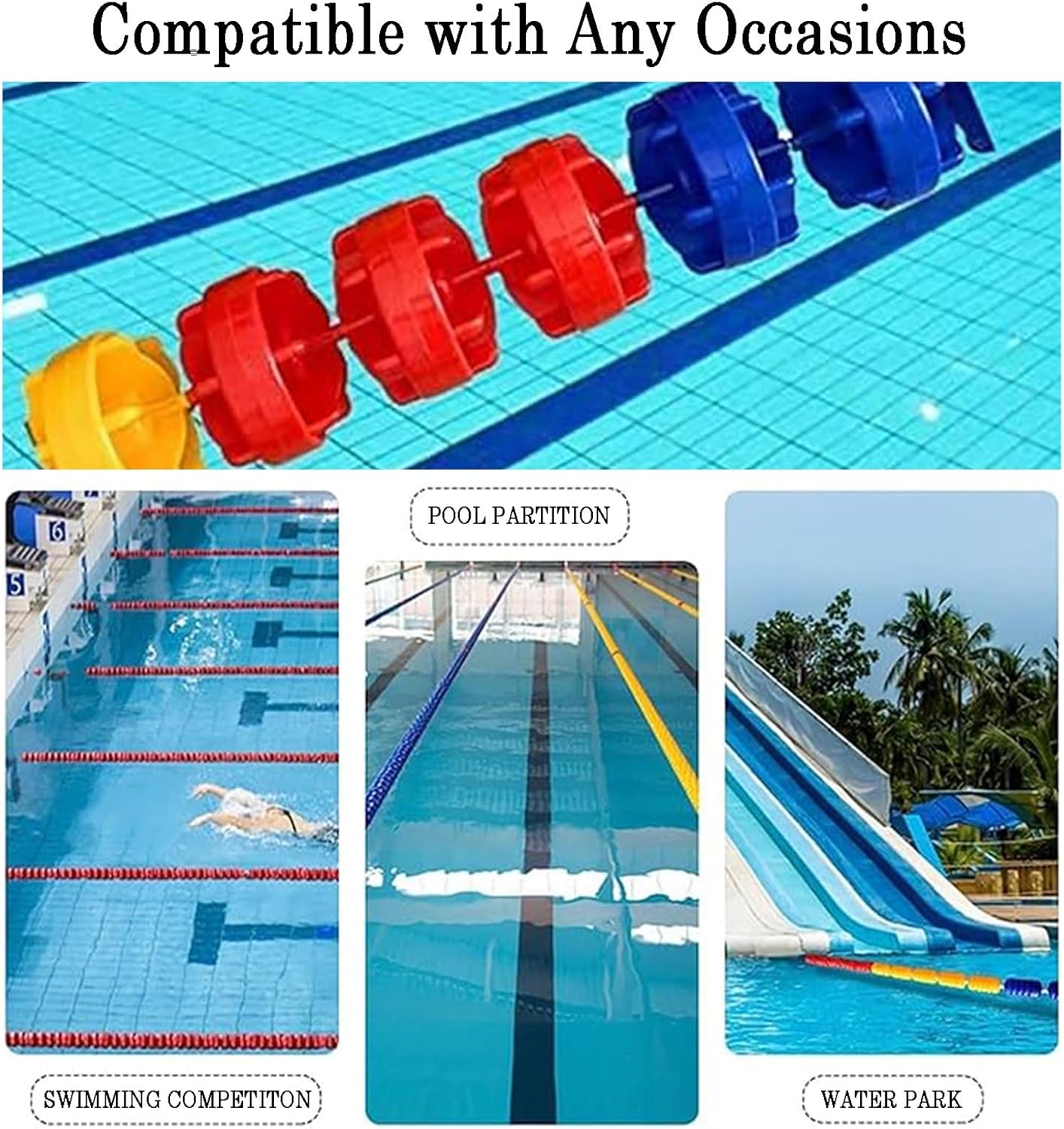 Pool Anti-Wave Divider Rope Pool Floats:Our pool safety dividers are designed with your family's safety in mind. Easy to install and built to last, these dividers adapt to various water environments, ensuring reliable protection for swimmers of all ages. **DESCRIPTION:** 1. Crafted from durable, thickened materials, our pool lane dividers promise stability and longevity, making them ideal for both residential and commercial use. 2. Featuring high-visibility colors, these pool buoys are easily identifiable in the water, allowing swimmers to clearly recognize designated areas for safety. 3. Engineered with strong buoyancy, our dividers float steadily on the water's surface, providing effective barriers that withstand interference from waves and currents. 4. The adjustable length feature ensures that you can customize the dividers to suit your specific needs, whether for lap swimming or separating play areas. 5. Perfect for delineating hazardous zones or swimming lanes, our safety buoys enhance visibility and organization in any pool setting. 6. Installation is a breeze with included accessories, ensuring a firm and stable setup that prevents loosening over time. **SPECIFICATION:** Product Name: Pool Lane Dividers / Pool Safety Rope / Swimming Pool Safety Divider Applicable Scenarios: Ideal for indoor and outdoor swimming pools, inland waterways, shallow areas, fishing zones, and more. Custom lengths available to meet your requirements. **PACKAGING INCLUDES:** 1 x Pool Lane Dividers **KIND TIPS:** 1. This listing includes only the Pool Lane Dividers; other items shown are for reference purposes. 2. A slight odor may be present upon receipt; this is normal and will dissipate within a few days. 3. Manual measurements may result in slight variations of 1-2 centimeters; please refer to the actual product for accuracy. Choose our pool safety dividers for peace of mind and enhanced safety in your swimming areas, allowing you and your loved ones
