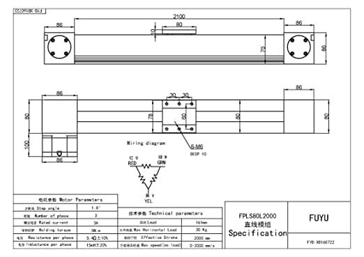 Effective Stroke: 1000mm Total Length: 1272mm Tatal Height: 80mm Slide Width: 80mm Maximum Horizontal Load: 30kg Max Vertical Load: 5kg[with brake] Max Horizontal Speed:300~1700mm/s[max loading] Max Vertical Speed: 300~600mm/s[max loading] Max Speed: 3000mm/s[No loading] Repeat position accurancy: ±0.1mm Driven Type: Belt Drive Stepper Motor Parameter: Phase : 3 phase Motor flange size: 86mm Motor length: 98mm Holding torque: 5 N.m Current: 3.0A Lead wire: 3