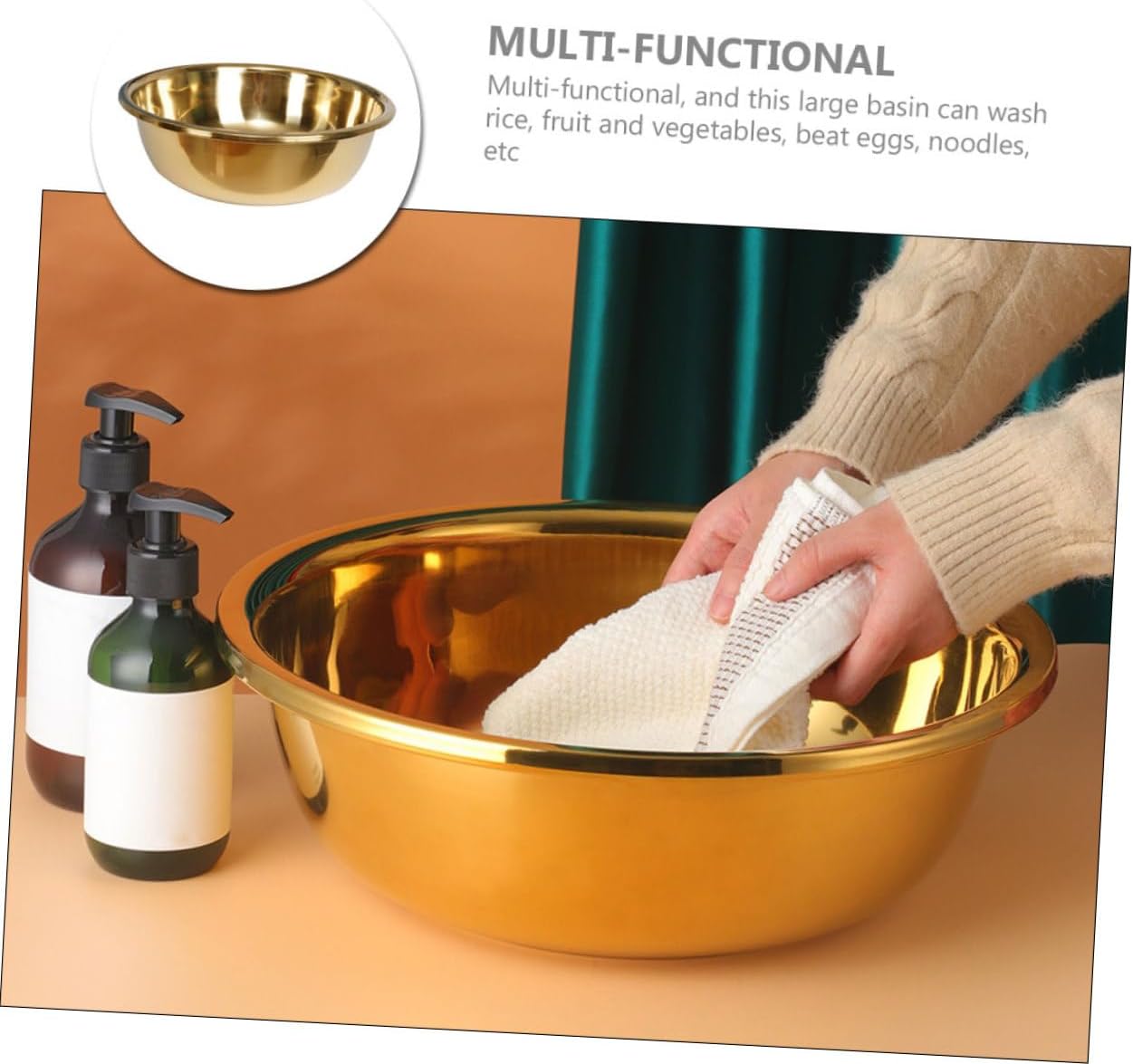 Package List 1 x Stainless Steel Basin Characteristics -Size:36.00X36.00X12.00cm/14.15X14.15X4.72in metal bowls mixing -Material:Stainless Steel large metal mixing bowl -Color:Golden kitchen vegetable basin -It can be given as a practical present to your friends, the special design makes them meaningful steel bowls. -This multifunctional storage basin is having a variety of use methods, to bring convenience to your life stainless steel mixing bowls. -The edges are widened, the use process is more convenient, and the collision resistance is stronger metal mixing bowls. -With simple design, the Stainless Steel Basin is easy to clean, stable to place, does not occupy space mixing bowl. -The edges are smooth, so there is no need to worry about cutting your hands, safe and reliable bowls for kitchen.Goods Informationlarge kitchen basin The basin is made of reliable stainless steel material, which has anti-wear and functions.flat bottom basin This mixing basin have a wide range of uses, suitable for mixing dough, washing rice, washing vegetables, washing fruits or even making washbasins.household washing basin Our Stainless Steel Basin is great choices for your kitchen
