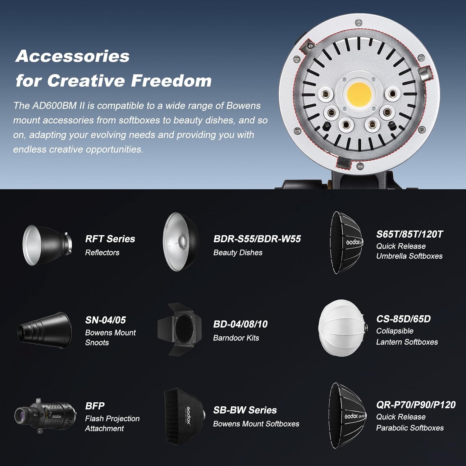 | Compatible Devices | Cameras with Bowens Mount |