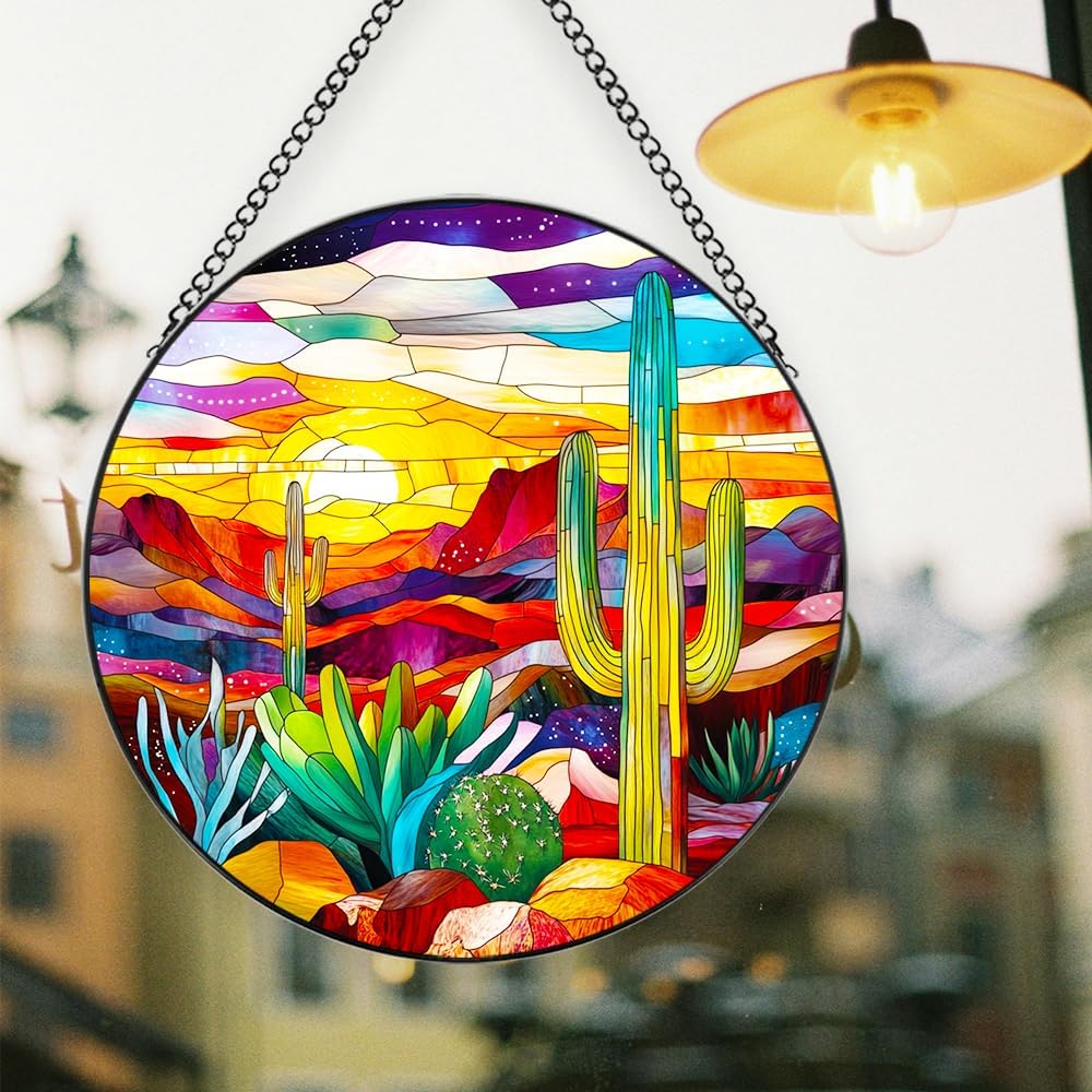 Introducing our exquisite Desert Cactus Stained Glass Sun Catcher! This stunning piece is meticulously handmade, featuring the iconic Saguaro cactus, a symbol deeply rooted in Southwestern landscapes. Measuring 7.8 inches, it showcases a captivating blend of fiery sunset hues, reminiscent of the breathtaking desert evenings. Crafted with care, each sun catcher is a unique work of art. The vibrant colors are achieved through traditional stained - glass techniques, ensuring that light filters through in the most enchanting way. Whether the sun is shining bright or soft ambient light is present, this window hanging decor will transform any space. Equipped with a sturdy chain, it's effortless to hang. Ideal for adorning your garden or patio, it adds a touch of Southwestern charm, creating a warm and inviting atmosphere. Indoors, it becomes a focal point in your home decor, infusing your living space with the spirit of the desert. This sun catcher isn't just a decorative item; it's a conversation starter. Its unique design makes it a perfect gift for those who appreciate art, nature, or Southwestern aesthetics. Bring the beauty of the desert into your home with this one - of - a - kind stained glass creation.