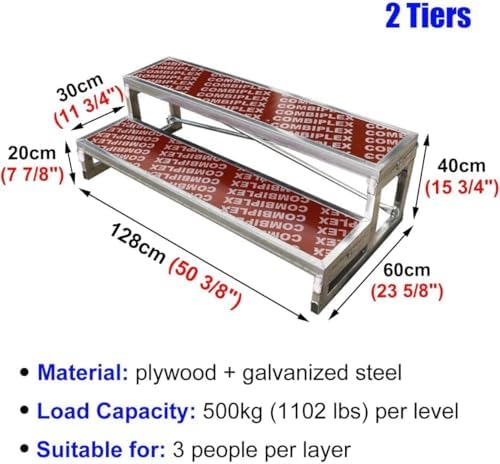 Are you looking for an effective solution to enhance visibility during group performances or photo shoots? Our choral risers are expertly designed to provide robust support, making them an essential addition to your event setup. Whether you are organizing a concert, a school play, or a community gathering, our risers ensure everyone is seen while adding a professional touch.**What’s Included:**- 1 Choral Riser**Specifications:**- **Material:** Durable Plywood and Galvanized Steel- **Tiers Available:** Choose from 1, 2, or 3 tiers- **Capacity per Tier:** Supports up to 3 individuals- **Weight Capacity per Tier:** 500 kg (1102 lbs)- **Dimensions:** - 2 Tiers: 128 x 60 x 40 cm (50 3/8" x 23 5/8" x 15 3/4") - 3 Tiers: 128 x 90 x 60 cm (50 3/8" x 35 3/8" x 23 5/8")**Key Features:**- Sturdy welded construction that provides exceptional strength and stability.- Anti-skid surface designed to enhance safety and prevent slips.- Each tier is engineered to securely hold 3 individuals, allowing for optimal group arrangements.- Quick and easy assembly for hassle-free setup, saving you valuable time.- Versatile use in concert halls, classrooms, theaters, and more.- Perfect for group photographs, performances, and a variety of events, ensuring everyone is visible.**Important Notes:**- Minor measurement variations of 1-2 cm may occur; actual dimensions should be considered.- Color representation may vary based on monitor settings and lighting; please refer to the actual product for true color accuracy.