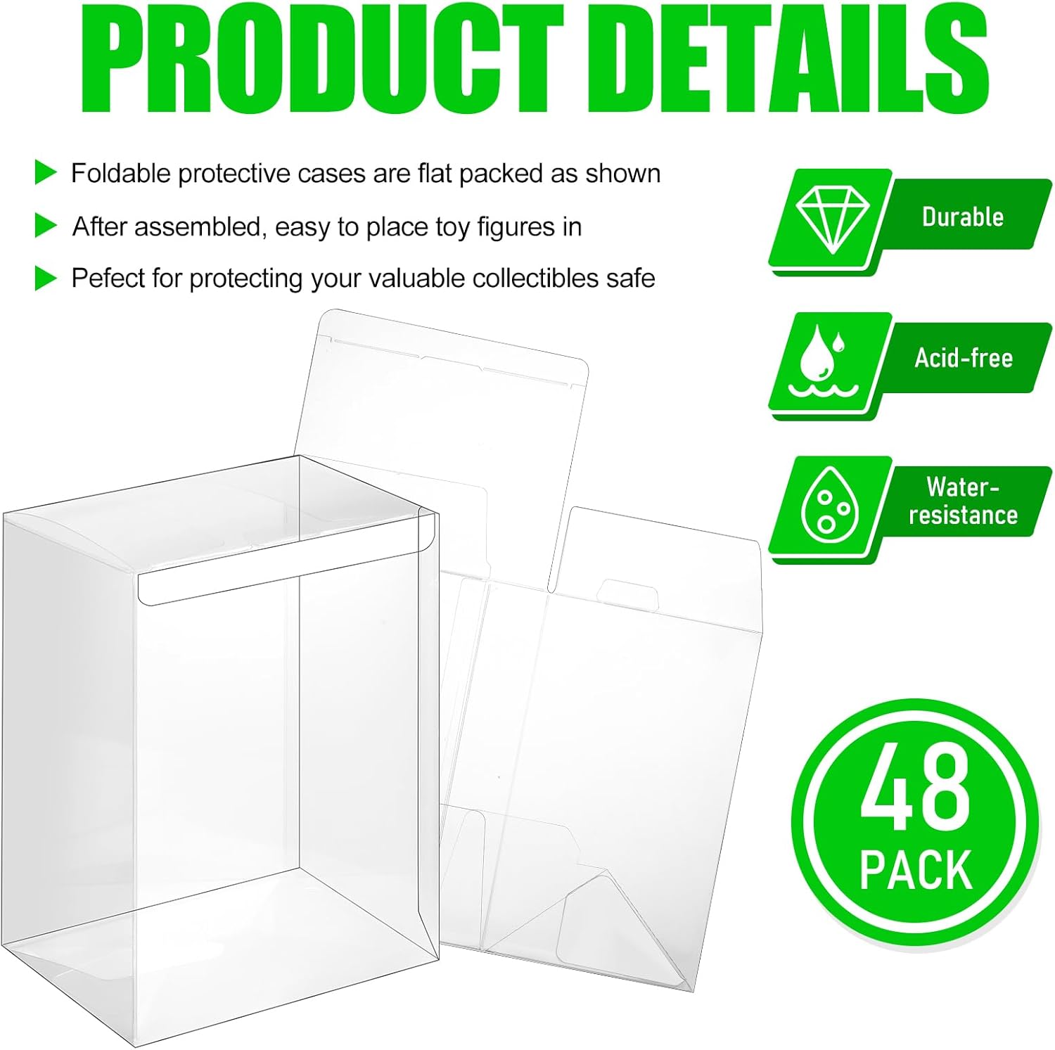 Features:Locking tab on the top:The clear containers box is designed with locking tab on the top, and the lock keeps the box closed. The label locks keep the lid flat and increase the structural integrity of the box, making you stack and display your collections easily.Keep your items safe:These transparent cube boxes can help you display and protect your collection easily, preventing dust and fingerprints. The clear design allows items visible, reading labels when they're neatly placed on shelves is an easy thing.Specifications:Material: PET plasticColor: clearSize: approx. 92.5 x 118.5 x 163 mm/ 3.64 x 4.67 x 6.42 inches, about 0.35 mm/ 0.01 inch in thicknessPackage includes:48 x Plastic storage boxesNotes:Manual measurement, please allow slight errors on size.The color may exist a slight difference due to different screen displays.Pointed parts included, please keep away from people under 12 years old.The brands mentioned above and any related model are only applied to demonstrate compatibility, not working as trademark using, our trademark is Hoteam. Kindly noted.
