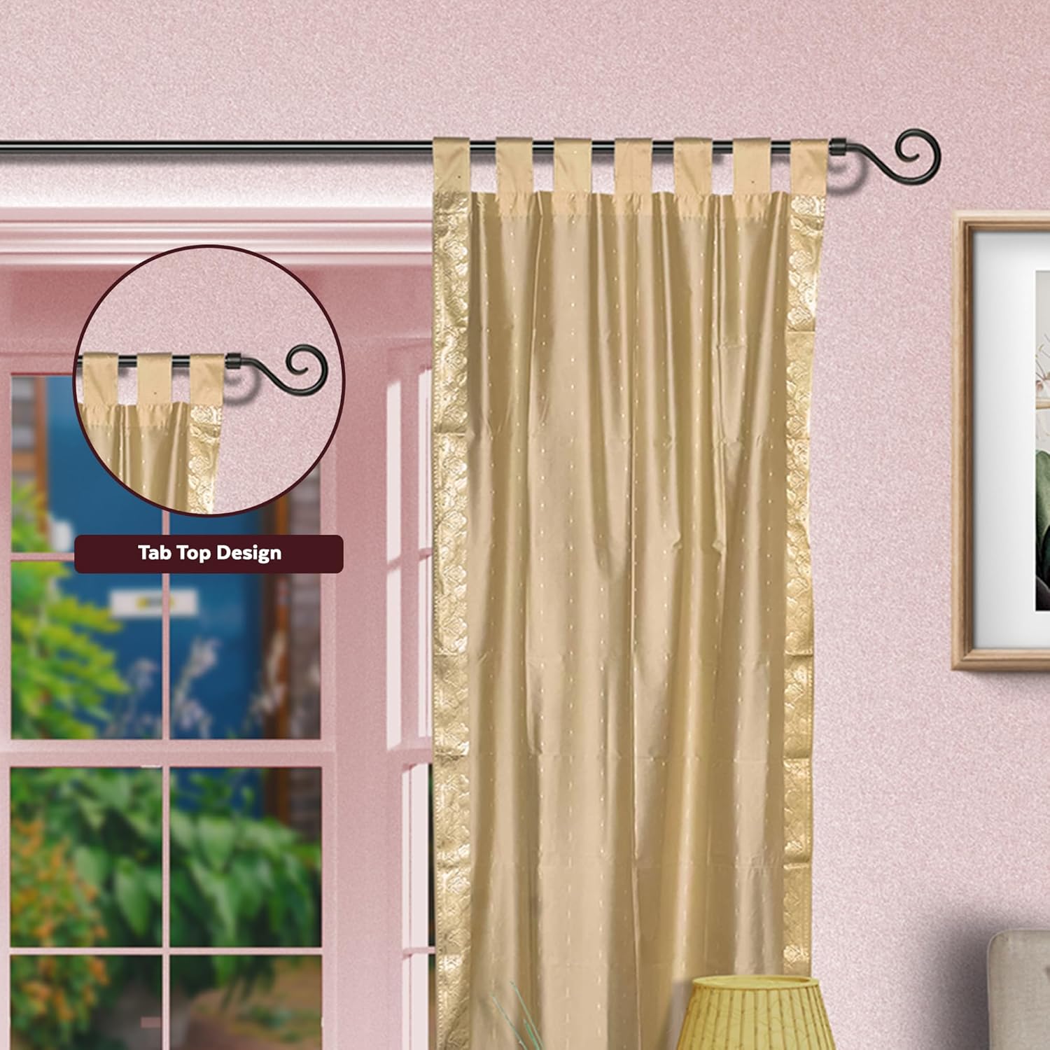 Add splendor to any room in your home with these Tab Top sari sheer curtains from India. These handmade drapes are heavily bordered with excellent artworkSari Curtains / Drapes / Panels are the perfect choice for those looking for light, elegant drapes with a touch of luxury. It has smooth finish with a soft sheen and feels gentle and cool to the touch. Sheer curtains made of saris allow light in through windows but prevent people looking in when they are drawn. Story Behind the Art: The fabric of these curtains are weaved on a hand-loom in a small rural village in India and then hand-dyed. The artisans are a group of young hand-crafters who have moved from small villages to a big town in Central India and make various home decor items out of these exotic sari fabrics. This gives these wonderful artisans a way to have sustainable income via selling to the worldwide market on the internet. Your purchase supports local and home-based work where the artisans can easily tend to their families and pass these time-honored skills from one generation to the next.