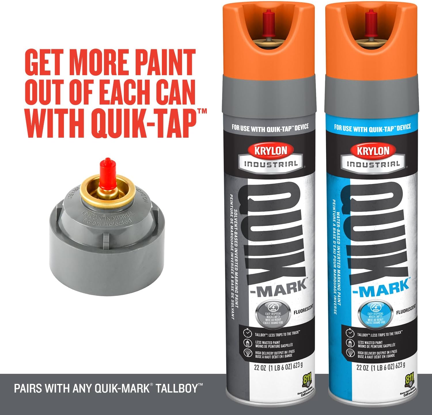 With a few easy twists, Quik-Tap allows you to get more paint out of each can, with easy disposal of empty cans in ANY recycling or waste bin. Punctured, empty cans minimize the need for hazardous waste disposal for you and your team. Quik-Tap is ready to use in seconds and lasts for up to 130 cans. It works with the same Tallboy Quik-Mark paint, marking wand and Glove Grip cap you've come to rely on. It maximizes productivity, minimizes downtime and reduces supply runs back to the truck.