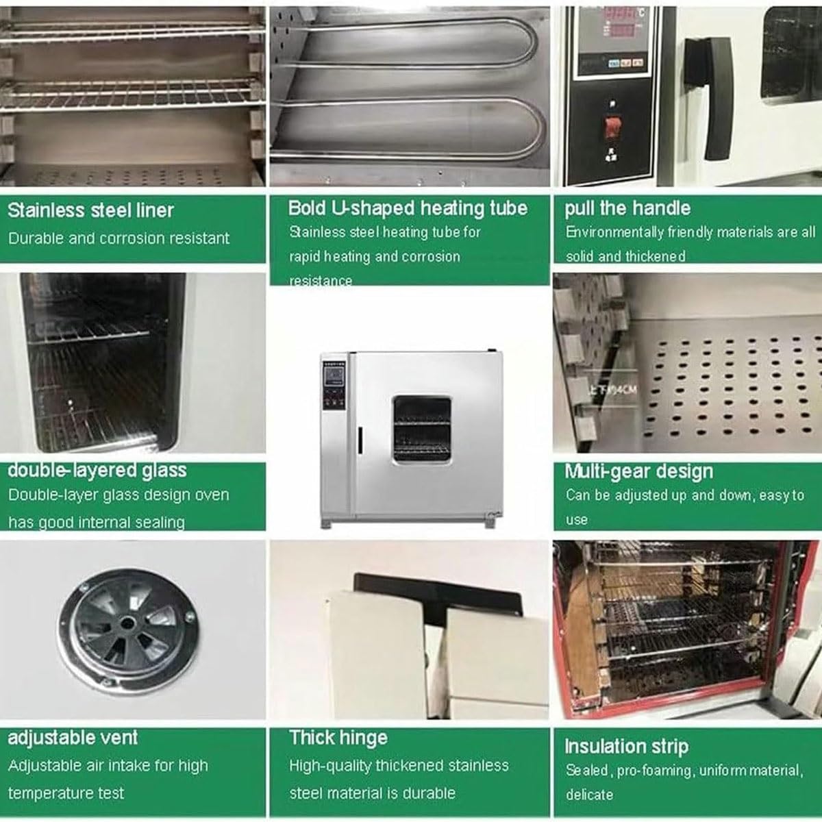 Constant temperature blast drying oven laboratory forced convection industrial digital constant temperature electric incubator. Widely used in Drying, baking and heat treatment of hospitals, teaching and scientific research, electronic components, food, industrial products, etc.Specifications:Name: Electric Blast Drying OvenCoating material: stainless steelTemperature control range: 50~300℃Temperature fluctuation: ±2℃Temperature resolution: 1℃Timing range: 1-9999minStandard partitions: 216LLining size: 25*25*25cmPower: 500WAppearance size: 54*37*43cmPacking size: 66*52*52cmPacking weight: 20kg43LLining size: 35*35*35cmPower: 800WAppearance size: 63*46*47cmPacking size: 73*61*60cmPacking weight: 30kgPackage Included:1 * constant temperature blast drying ovenNotes:1. Due to manual measurement, 2-3cm deviation is allowed.2. Different monitors have different calls, and the product color is subject to the actual product.