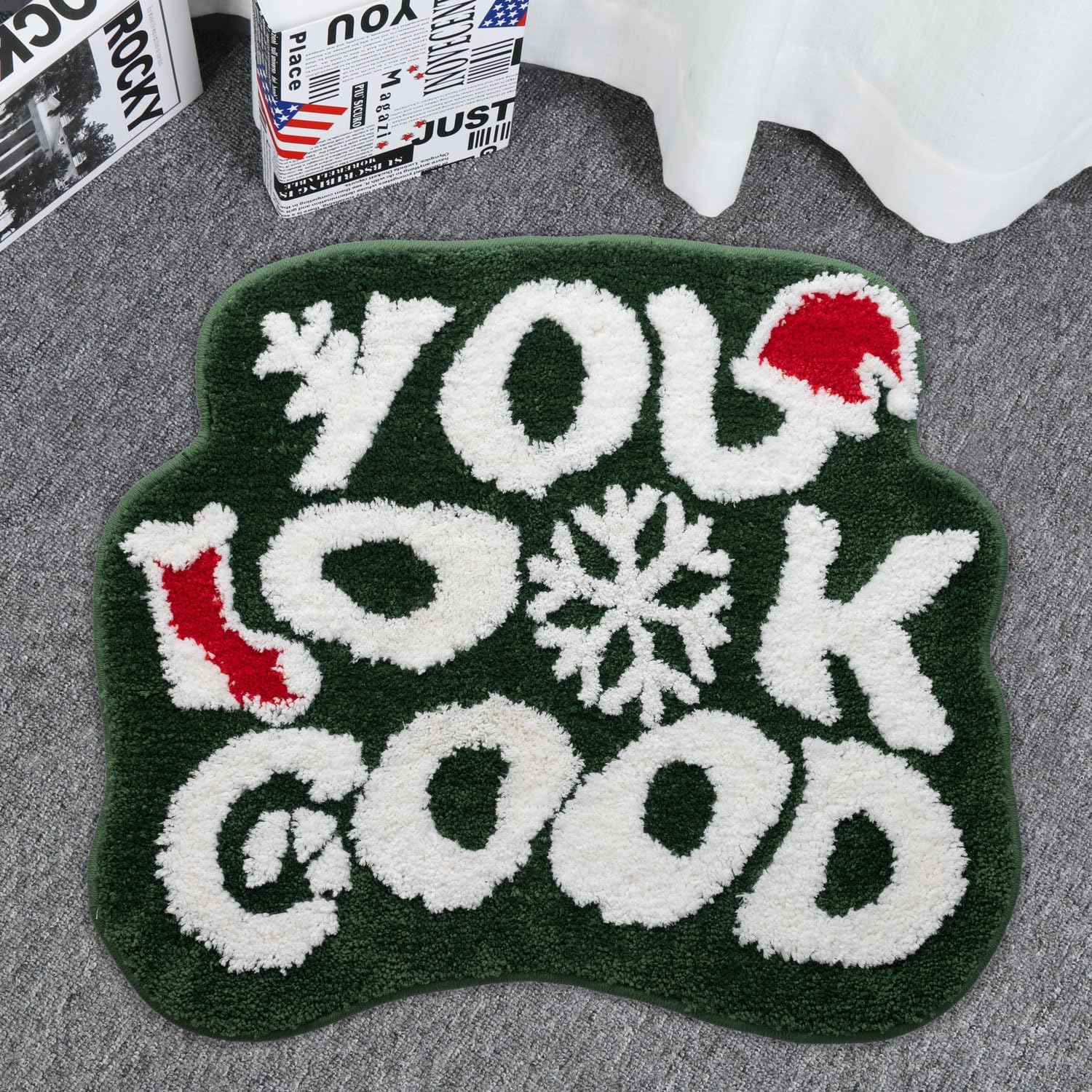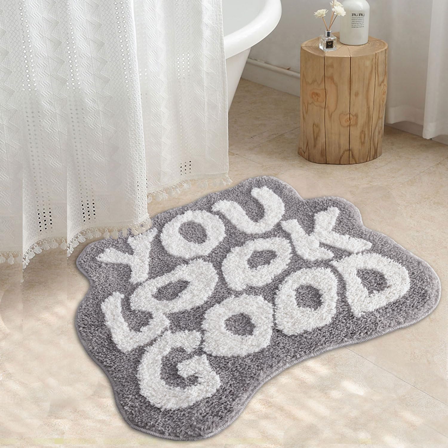 Welcome to Urtlmaji! We are proud to recommend our bow non-slip bath mat, which will make your bathroom safer and more comfortable. We understand the importance of safety in the bathroom, .and our you look good bath rug is designed with that in mind. It is made of high-quality plush material, providing a soft and comfortable touch for your feet while keeping them warm.Most importantly, our grey bathroom rugs non slip washable features a non-slip bottom design, ensuring stability while walking on wet and slippery surfaces. Say goodbye to worries about slipping or falling, and enjoy the pleasure of bathing without any concerns. This grey microfiber bath mat for bathroom rug also boasts a unique you look good pattern, adding a touch of nature and freshness to your bathroom. You can choose the color that matches your bathroom's style, creating a perfect blend with your decor.Furthermore, our you look good plush bathroom rug is easy to clean and maintain. Simply wipe or wash it gently to keep it looking beautiful and hygienic.Whether you're purchasing it for yourself or your family, our bath rug is an ideal choice. It not only provides safety and comfort but also adds a touch of fashion and nature to your bathroom.Purchase our funny bath mat now and make your bathroom safer, cozier, and more enchanting! Dimensions: 18”x 24” 21”x 25” 24”x 30”30”x 39” 20”x 32”20”x 60” Material Fabric: Microfiber Backing Material:TPR Pattern: you look good letter Weave Type: Machine Made Special Feature: Washable,Fluffy,Non Slip, Absorbent Room Type: Bathroom, Laundry Room, Kitchen, Bedroom, Living Room Care Instruction: Machine Washable