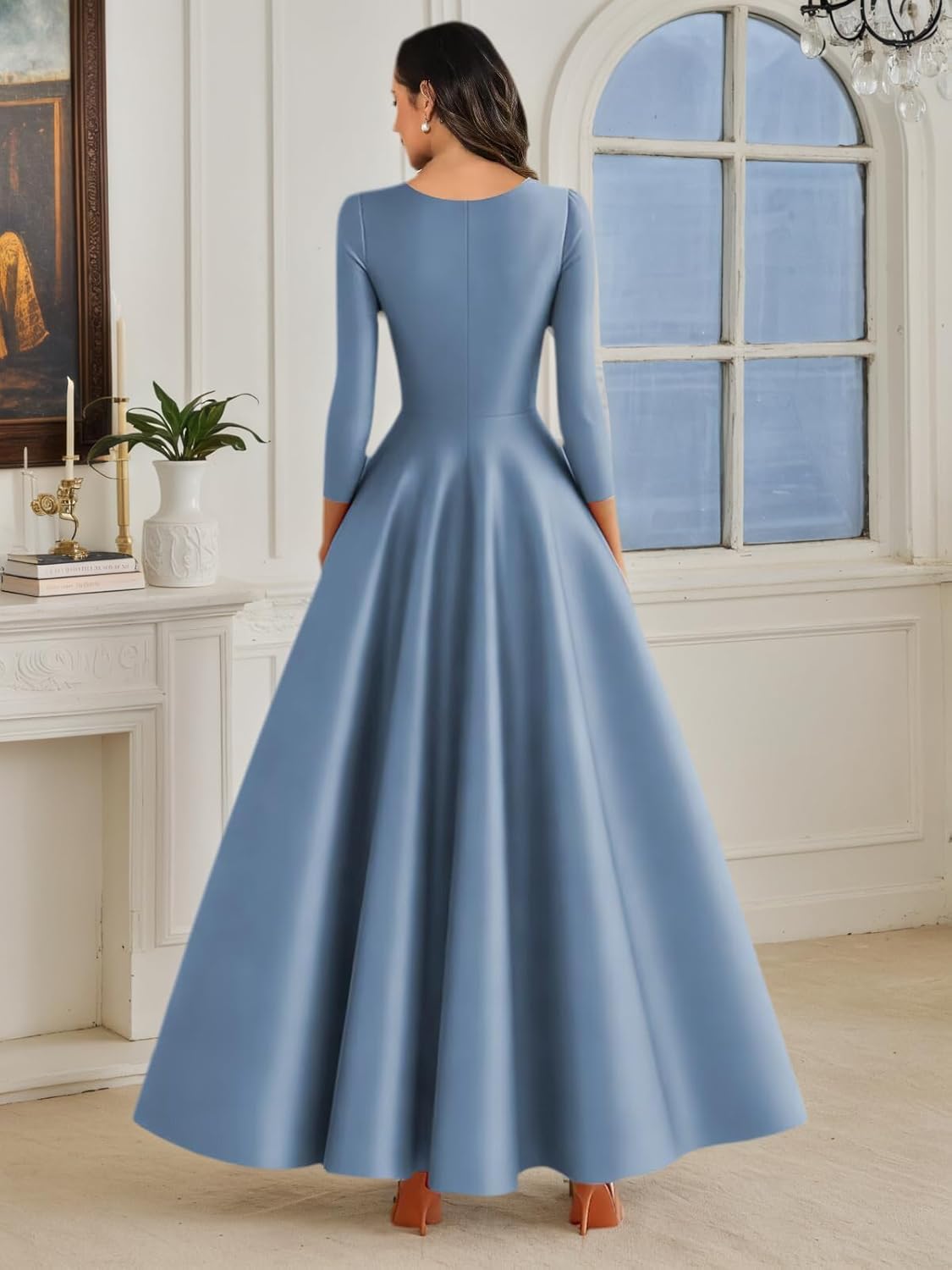 | Embellishment Feature | A Line, Long Sleeve, Satin, Tea Length, with Pockets |