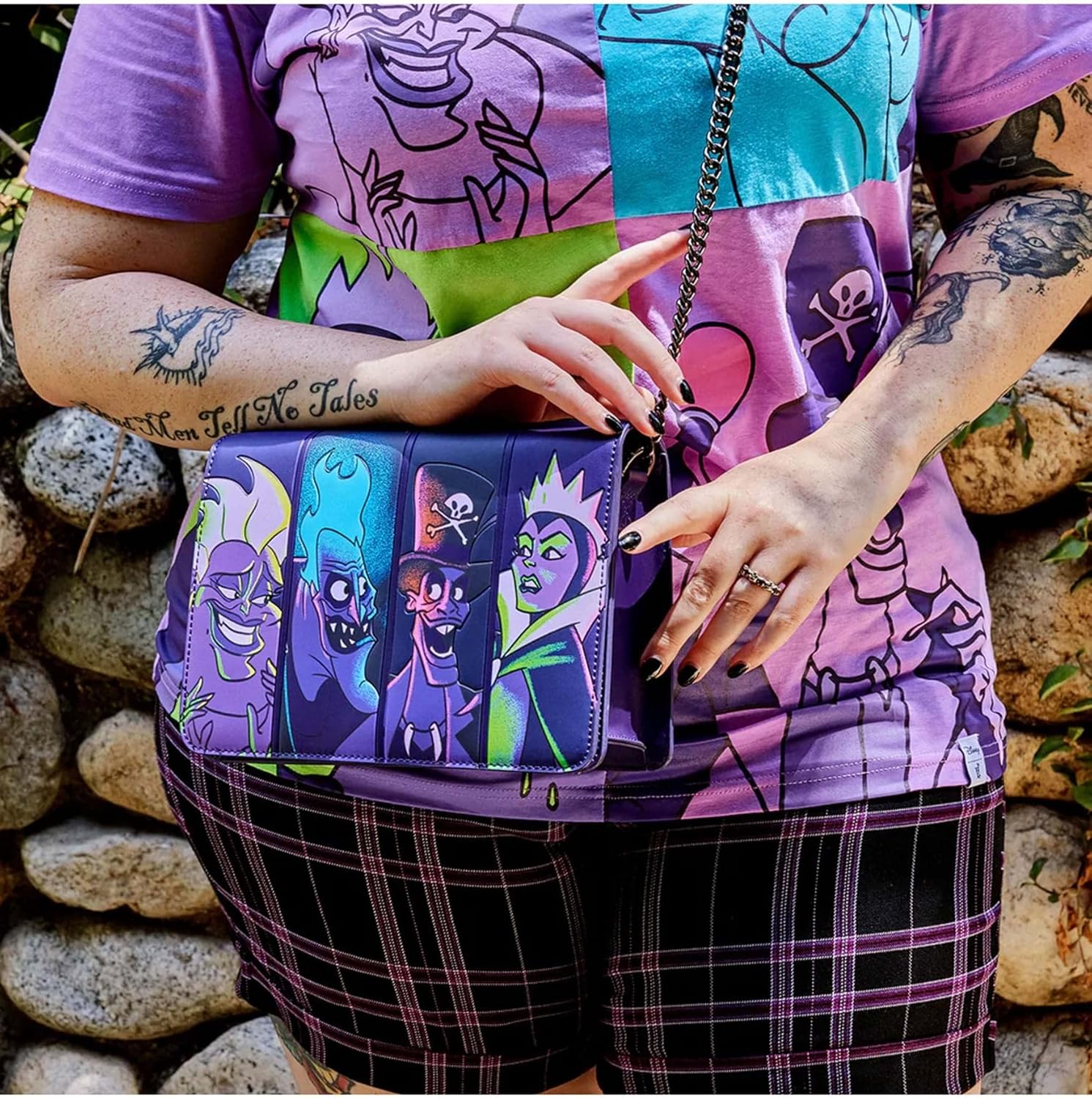 Your best fiends have gathered to escort you on your journeys! Be wickedly fashionable as you carry this Loungefly Disney Villains Glow Crossbody Bag along with you. Ursula, Hades, Dr. Facilier, and the Evil Queen are eager for the opportunity to accompany you! Each Disney Villain exudes a colorful aura. Ursula’s silhouette shows a golden hue, while Hades’ is cast in blue. Dr. Facilier is outlined in red, and the Evil Queen’s silhouette is green. On the back, you’ll find symbols associated with each villain, including the poison apple, a blue flame, a golden conch shell, and a colorful mask. This crossbody bag is the perfect accessory for tucking away all the things you need for a grand scheme—or for transforming everyday travels into wonderfully wicked adventures.