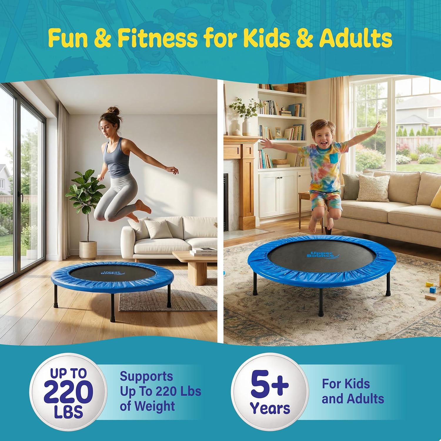 Bring energy-efficient fitness into your home with the Machrus Upper Bounce Mini Trampoline. This versatile mini exercise trampoline for adults and kids is designed for users of all ages, offering a fun, low-impact way to stay active indoors or outdoors. Its sturdy heavy-gauge steel frame and high-tension springs provide reliable support for up to 220 pounds, while the vinyl-covered safety pad and non-marking rubber feet protect both you and your floors during workouts. Practicality meets performance with this mini workout trampoline for adults. It folds easily in half for compact storage under beds or in closets. The polypropylene jumping mat delivers a responsive bounce suitable for everything from light rebounding to dynamic cardio sessions. Whether you're warming up, cooling down, or enjoying a full fitness routine, this trampoline exerciser supports your wellness goals with minimal space requirements. Safety and simplicity were top priorities in its design. Assembly is quick with the included manual, which also features a starter workout program. Ideal for home gyms, apartments, or even office breaks, the Machrus Upper Bounce Mini Trampoline makes exercise accessible, enjoyable, and easy to integrate into your daily life.
