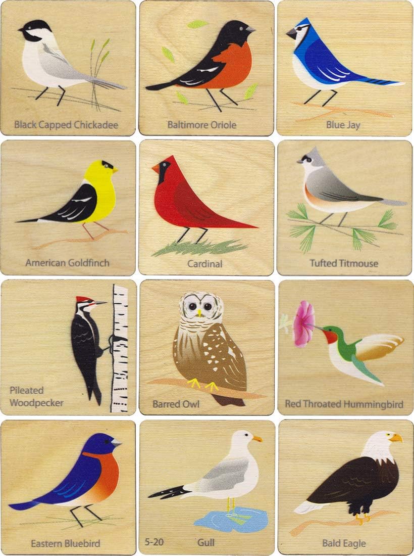 Any birdwatcher will love this special set of memory tiles. The set features a dozen of the most common birds in the U.S. Birds such as the chickadee, hummingbird, goldfinch, and the cardinal. Learn to match images and names. The set is shipped shrink wrapped with a cloth pouch for storage and playing instructions.