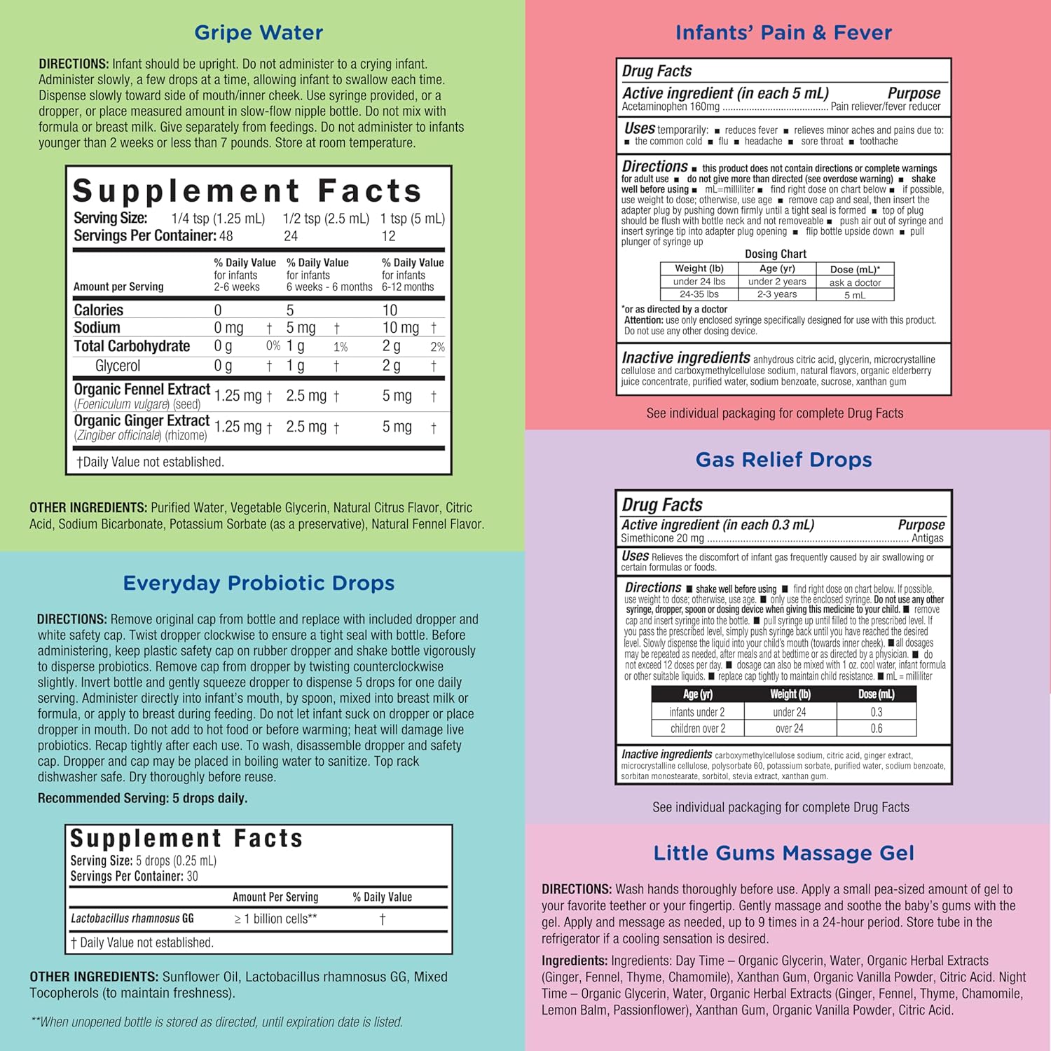 Mommy's Bliss Ultimate Baby Gift Set is a curated collection of essentials to support you and your little one during their first year. This all-in-one kit includes our most-loved baby products: Everyday Probiotic Drops to support digestive health and immune function*, Original Gripe Water to ease fussiness and colic*, Soothing Gum Massage Gel for tender gums, Infants’ Pain & Fever Relief, and Gas Relief Drops for fast relief from gas. It’s the perfect gift for expecting parents, ideal for baby shower gifts or adding to baby registries. Each product is crafted with trusted, gentle ingredients: no dyes, no artificial colors or flavors, no added sugar, no gluten, and free of the top 9 allergens.