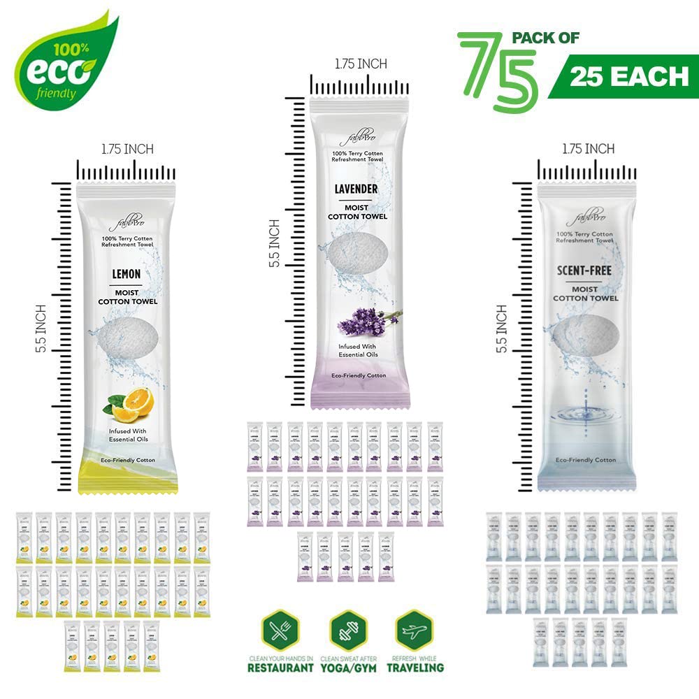 FabbPro 75 Pack of 8” x 8” Oshibori Moist Terry Cotton Towels Refresh Your Scenes with a Pre-Moistened 100% Cotton TowelFeatures and Benefits:Individually Wrapped:Large pack of 75 pre-rolled 8 x 8 inch wet moist cotton towelettes that are ready to go right out of the wrapping. Small convenient size to take with you anywhere on-the-go while in the car, traveling, or commuting to workPre-Moistened:Not overpowering - you will love the refreshing and relaxing feel each Oshibori moist cotton towel gives offStay Refreshed and Relaxed: Simple yet versatile moist towels that can be used either hot or cold. Refreshing feeling when used chilled on a hot day, after playing sports, or working out. Heat up in a microwave or towel warmer for a relaxing spa like feelingUse at your place of business or in your own home… For hotel guests, relaxing spa treatment or at massage parlor, restaurants to clean your hands, use at weddings to refresh in the bathroom, traveling by plane or public transportation to help relax, after the gym or yoga, sports to remove sweat, at a dental or medical office, outdoors, or to just keep in your own home to use whenever you want! The possibilities are endless. Sit back, relax, and unwind with our moist 100% Cotton Oshibori Terry Refreshment Cloths