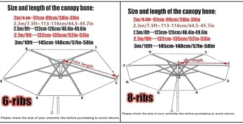 Transform your outdoor space with our high-quality umbrella replacement fabric, designed to enhance the longevity of your patio umbrella. Made from durable 180g polyester fabric, our canopy covers are not only waterproof but also UV-resistant, ensuring your outdoor relaxation remains comfortable and protected from the elements. Available in various sizes—2M (6.5FT), 2.7M (8.8FT), and 9.8FT—our replacement covers fit perfectly on multiple umbrella frames. Each cover is designed with a selection of classic colors, including Beige, Black, Burgundy, Cement, Dark Green, Grass Green, Khaki, Lake Blue, Navy Blue, and Red, allowing you to match your outdoor decor effortlessly. Our easy-to-install canopy covers provide a brilliant solution for those looking to refresh their patio umbrellas without the expense of buying a new one. Whether you're hosting a backyard barbecue, enjoying a quiet afternoon by the pool, or creating a shaded play area for kids, our replacement fabric ensures your umbrella remains a stylish and functional addition to your outdoor setting. When measuring for the correct size, ensure the ribs of your current umbrella meet the following dimensions: - For the 6.5ft (2m) umbrella, each rib should measure 38 to 39 inches (97 - 99 cm). - For the 8.8ft (2.7m) umbrella, each rib should measure 52 to 54 inches (132 - 134 cm). - For the 9.8ft umbrella, each rib should measure 57 to 59 inches (145 - 147 cm). Enjoy the benefits of a vibrant, durable canopy that not only enhances your outdoor experience but also stands the test of time. Choose our umbrella replacement fabric for a practical and stylish outdoor solution.
