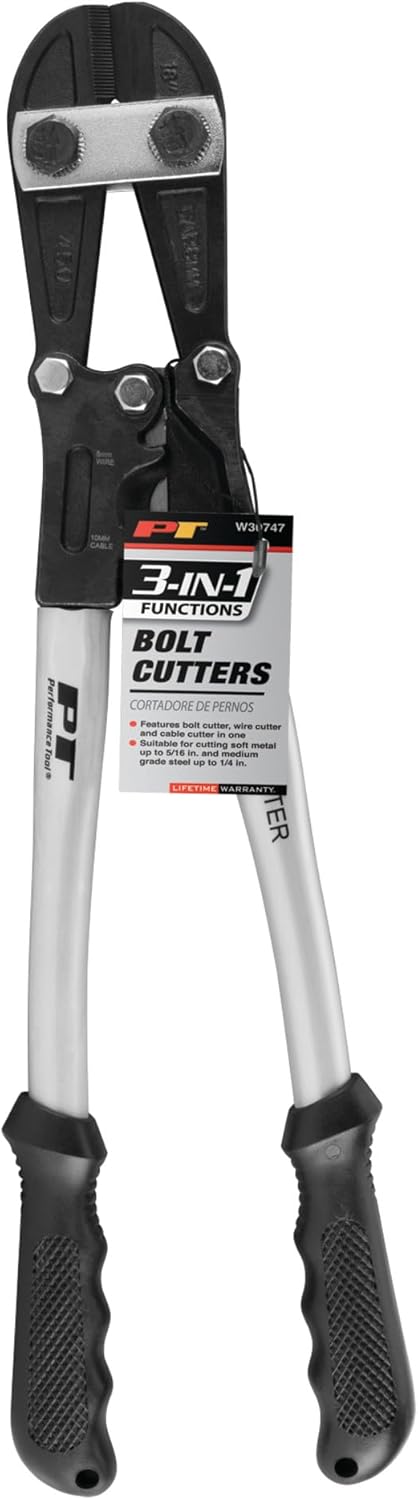 The Performance Tool 3-in-1 Bolt, Wire and Cable Cutter is a versatile cutting tool that can handle soft metals up to 5/16" (8mm) and medium-grade steel up to 6mm or 1/4". The drop forged chrome vanadium steel blades are precision sharpened to ensure clean cuts every time. You'll have optimal comfort and control while using these cutters thanks to the comfortable molded rubber grips. To adjust the cutting edges, simply loosen the nuts on the cam bolts and rotate them to move the arrows inward until the jaws align. Please note that these cutters are designed to cut steel with an HRC under 35º and do not twist or pry while cutting to ensure safe and effective use. Upgrade your cutting game with the Performance Tool 3-in-1 Bolt, Wire and Cable Cutter.