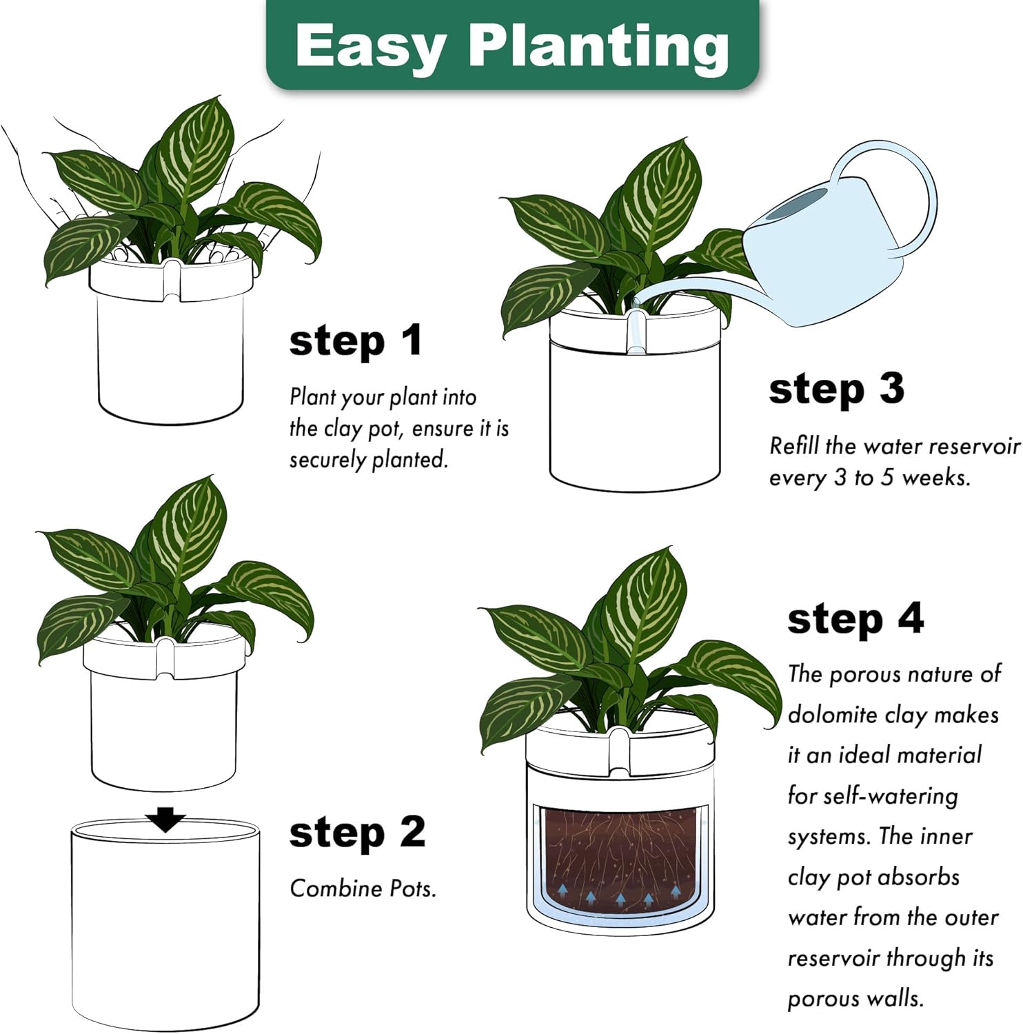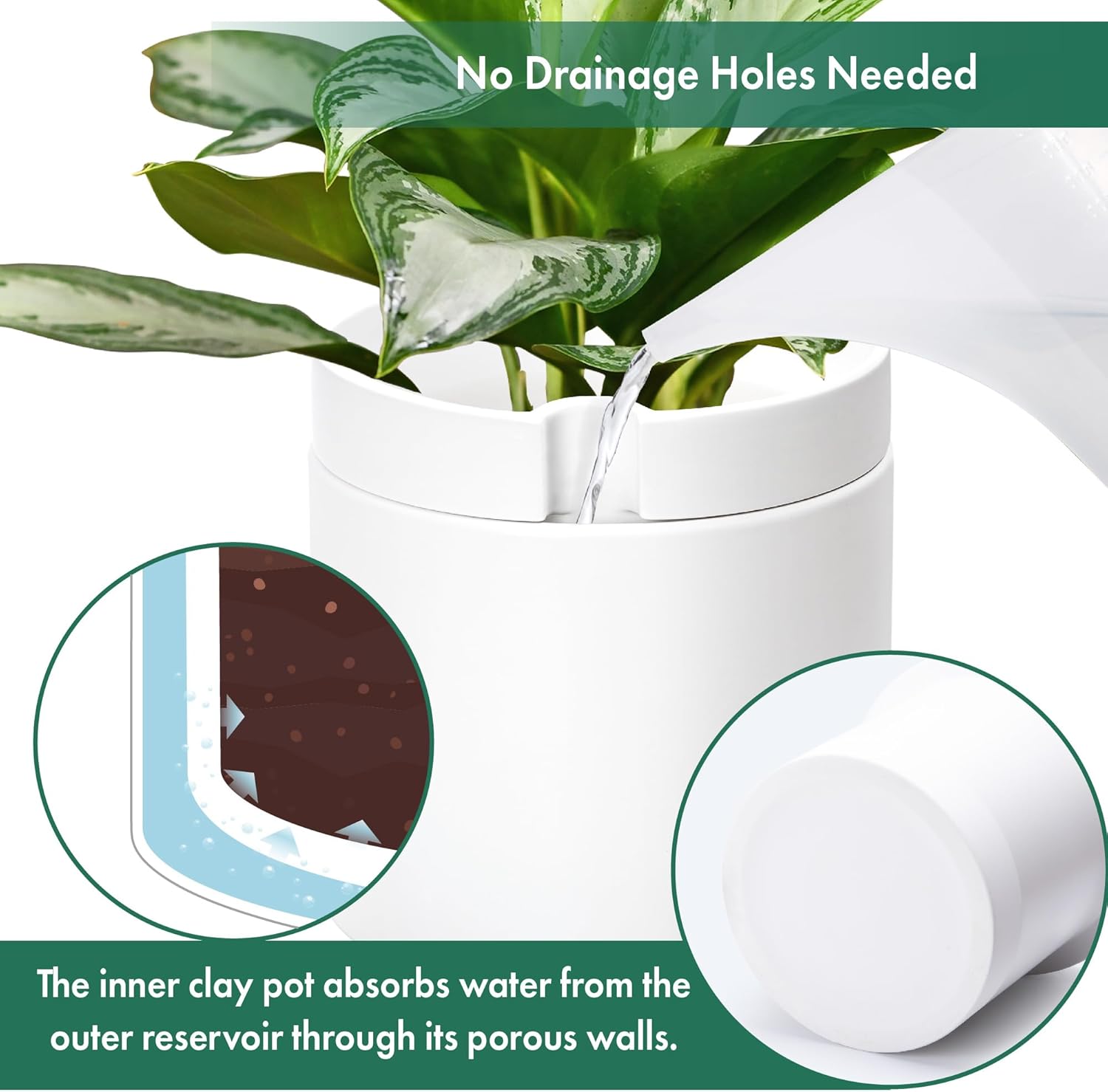 Phoenix Vine 10 Inch Cylinder Self Watering Planter, White Glazed Outer Plant Pot with Dolomite Clay Inner Planter for Indoor Plants, White, 31-A-I-W