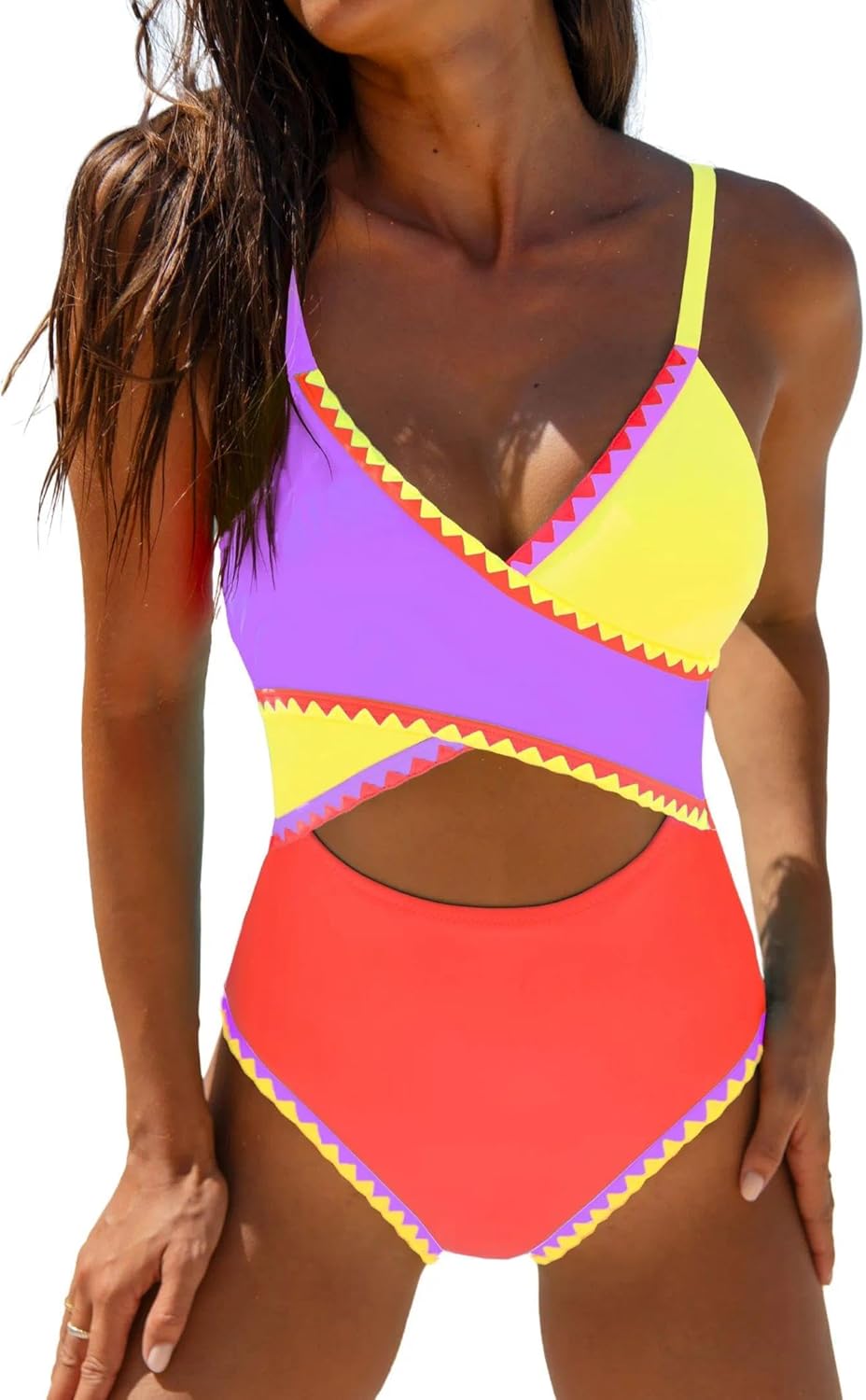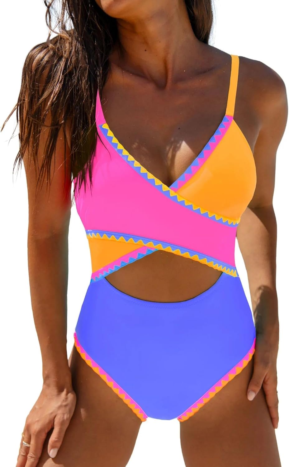 Popvil Women's One Piece SwimsuitComplete your summer closet with the Popvil Women's One Piece Swimsuit. Designed with a deep V-neckline, this sleek and sexy swimsuit is figure-flattering while providing full coverage. It will make you feel confident and slim whether you are on the beach or enjoying water sports at the pool or on the boat. The high waisted design not only enhances your natural curves, but also provides extra support for women.The V-neck one piece swimsuit is edged with neon color-blocked trim, which is a perfect blend of sweetness and sexiness.The neon colors and color blocking make it a standout choice for a beach outing, pool party, or spa day. This one piece swimsuit is available in a variety of sizes, including Small, Medium, Large and X-Large to ensure the swimsuit fits women perfectly. Whether you're a mom looking for a supportive and aesthetically pleasing swimsuit or a young woman who wants to keep up with trends, this one piece swimsuit is a great choice. It has a cute and chunky design that makes it suitable for a variety of activities, including swimming. The full coverage ensures that you feel comfortable and confident, and the clever stitching of multiple colors not only adds layers, but also adds fun and style to the overall look.