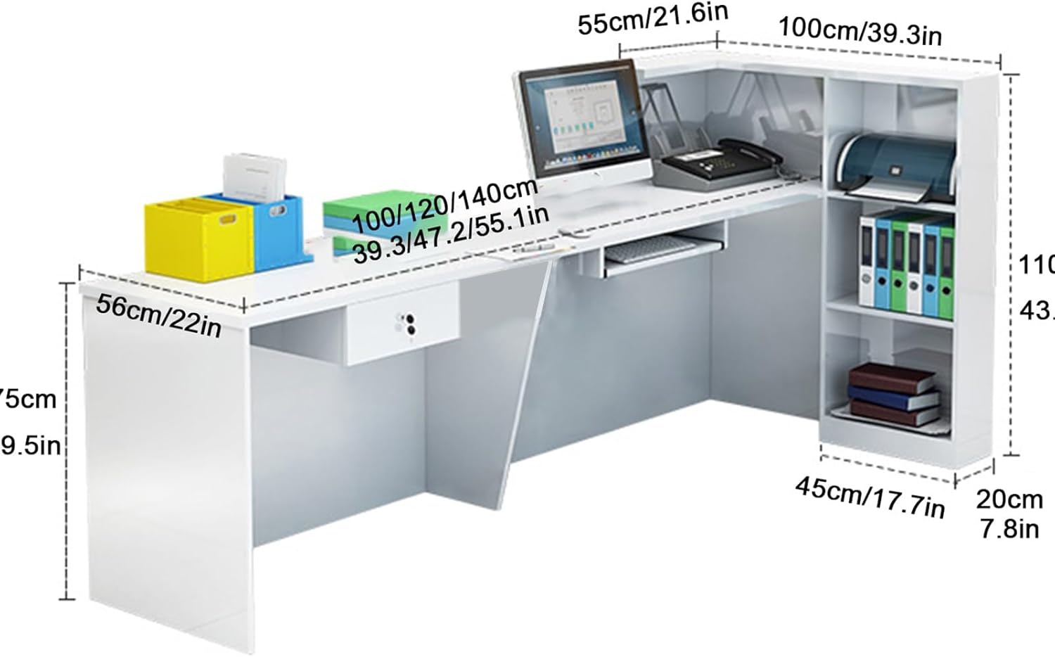 This YQMHEZ register/company reception desk/reception counter features a unique style with a simple and modern design, and can be perfectly integrated into various business scenes to enhance the appearance of the store.Its reasonable layout optimizes the use of space, with multiple drawers and spacious countertops for storage and storagehigh-quality material selection ensures sturdiness and durability, and thickened panels prove excellent qualityProduct details:Color: Black, Blue, Green, Orange, Red, WhiteMaterial: MDFReception counter dimensions: 120/140x56x110cm,47.2/55.1x22x43.3inScope of delivery:1 x reception counterThings to note:1. The above dimensions are manually measured and there may be an error of 1-3 cm. Please refer to the actual product.2. Due to factors such as display and light, there may be color difference, please understand.3.For safety reasons, children are not allowed to climb on or play with the product.4.Keep the product away from chemicals.