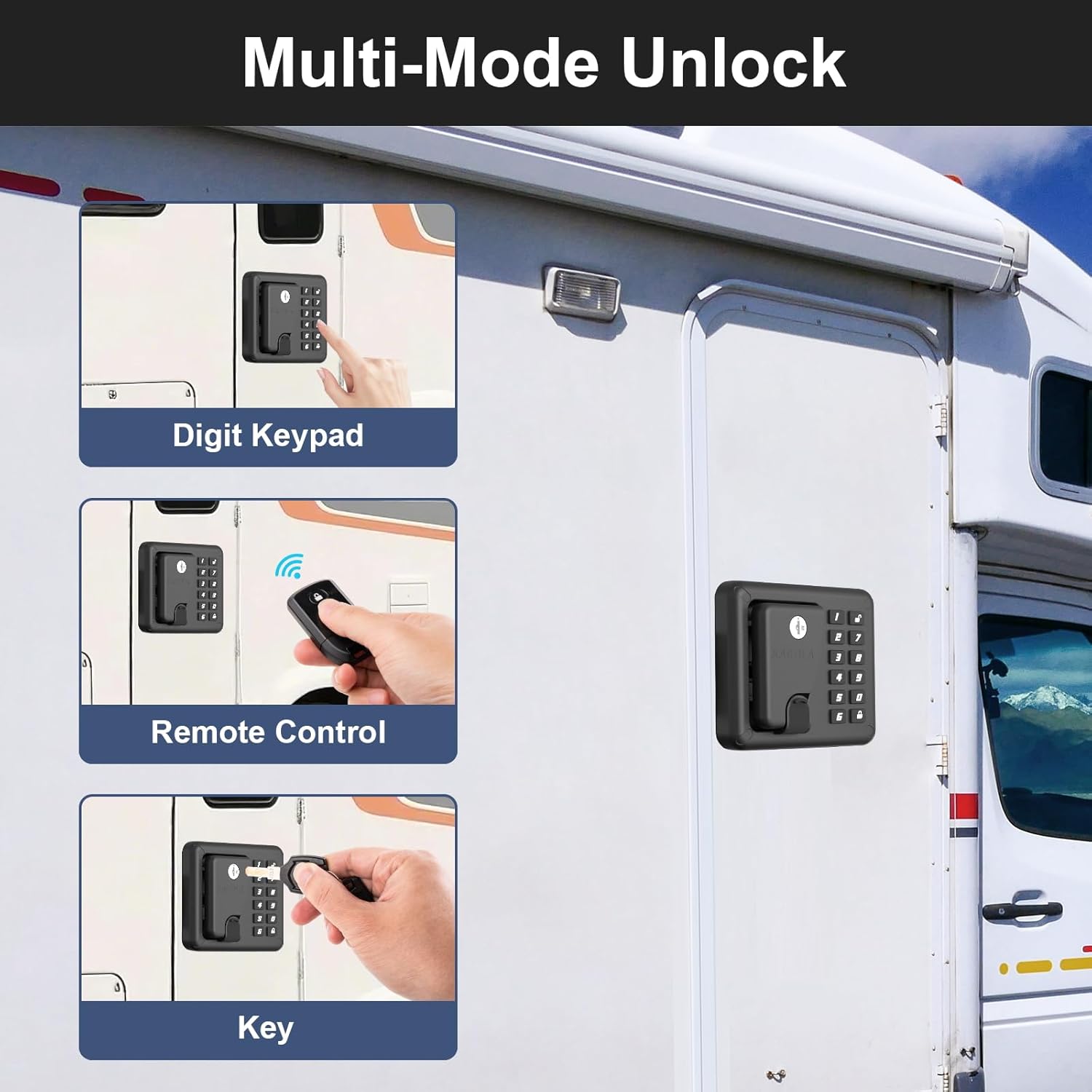 • 【Three Unlocking Methods】Our RV door lock features three methods of unlocking, powered by 4 AAA batteries and includes 4 standard keys. It can be used even when the battery is depleted during travel, and it also offers an easily programmable keypad for access and locking. Additionally, it comes with two integrated FOB remote control keys that allow for wireless unlocking from up to 60 feet away, freeing your hands for other tasks.
