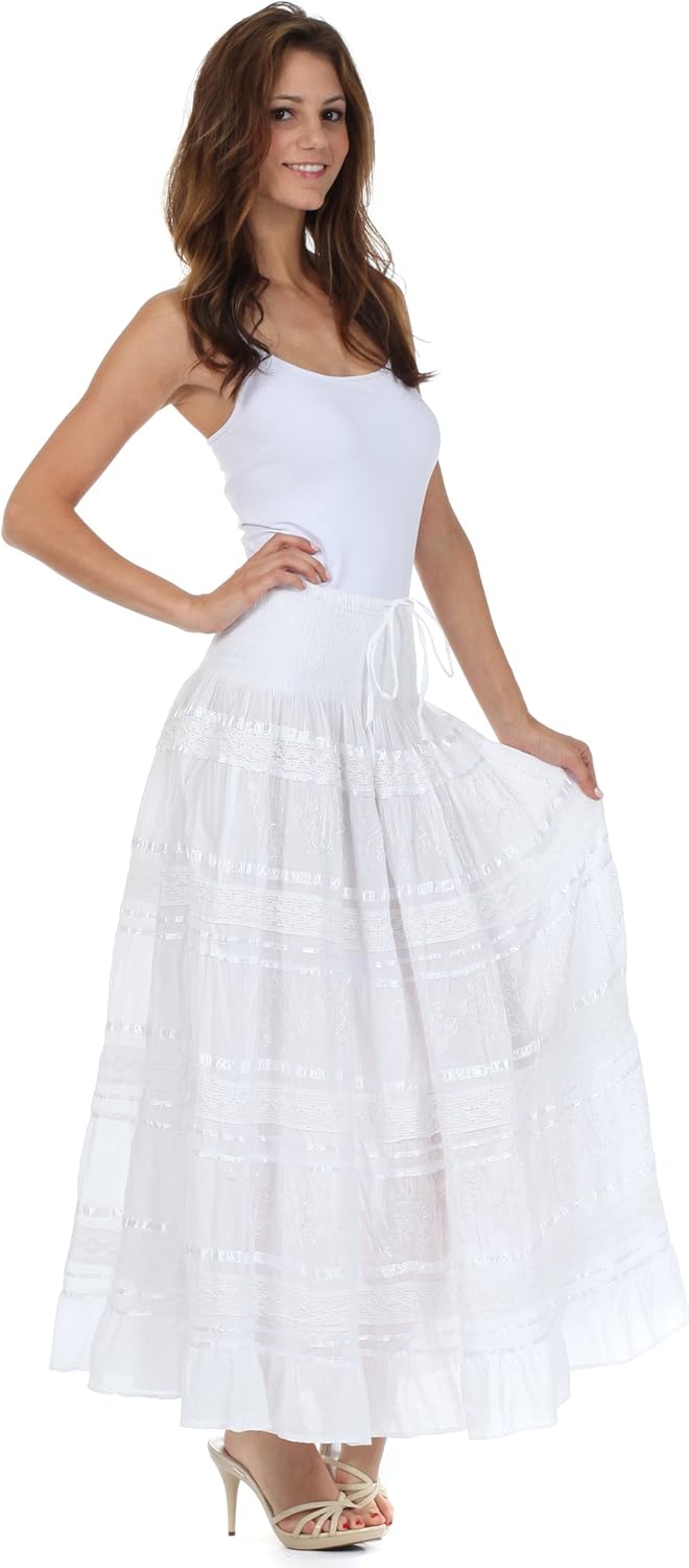 Women's cotton peasant skirt features beautiful embroidered detail, ribbon and lace accented tiers and smocked waist with drawstring.