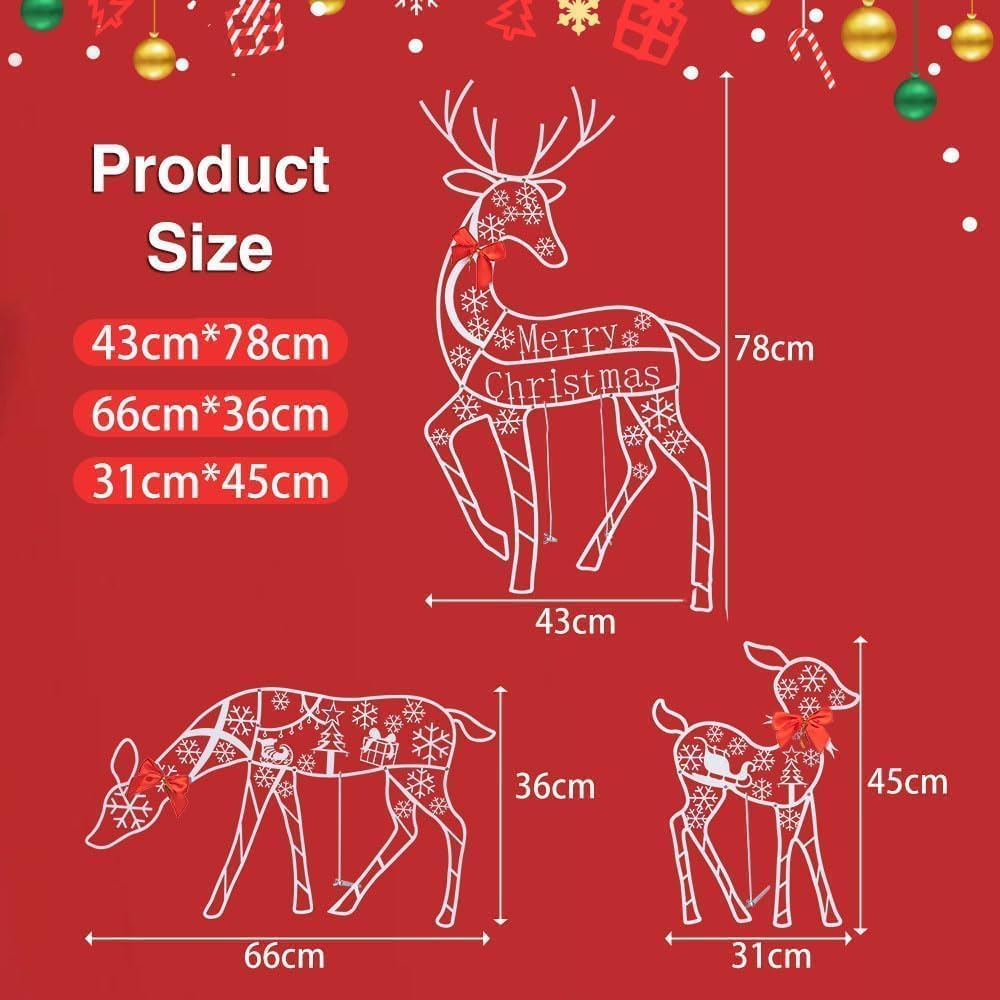 1.Holiday Elegance - Embrace this radiant reindeer Christmas decoration, featuring a magnificent buck, a graceful doe, and a charming fawn in a set of three decorations, to elevate the holiday atmosphere by adding our fantastic Christmas decorations indoor and outdoors to your home with a delightful touch of Christmas enchantment.2.Meticulous Craftsmanship :Our Christmas reindeer yard decorations are crafted from metal, these Christmas deer Xmas decorations figures are designed for both indoor and outdoor utilization. The reindeer Christmas outdoor decorations is adorned with LED lights that emit a warm and inviting glow, enhancing the festive atmosphere!3.Package include:Christmas glow Elk x 1 set(Elk dad x 1, Elk mother x 1, Elk baby x 14.Note:Please allow 0.5-1cm error due to manual measurement. pls make sure you do not mind before you bid. Note: The product is not equipped with electronic, need to buy by yourself Due to the difference between different monitors, the picture may not reflect the actual color of the item. Thank you!5.Specifications:Material: Aluminium alloy (Non corrosive, non rusting, multiple uses) Color: White Size: As shown