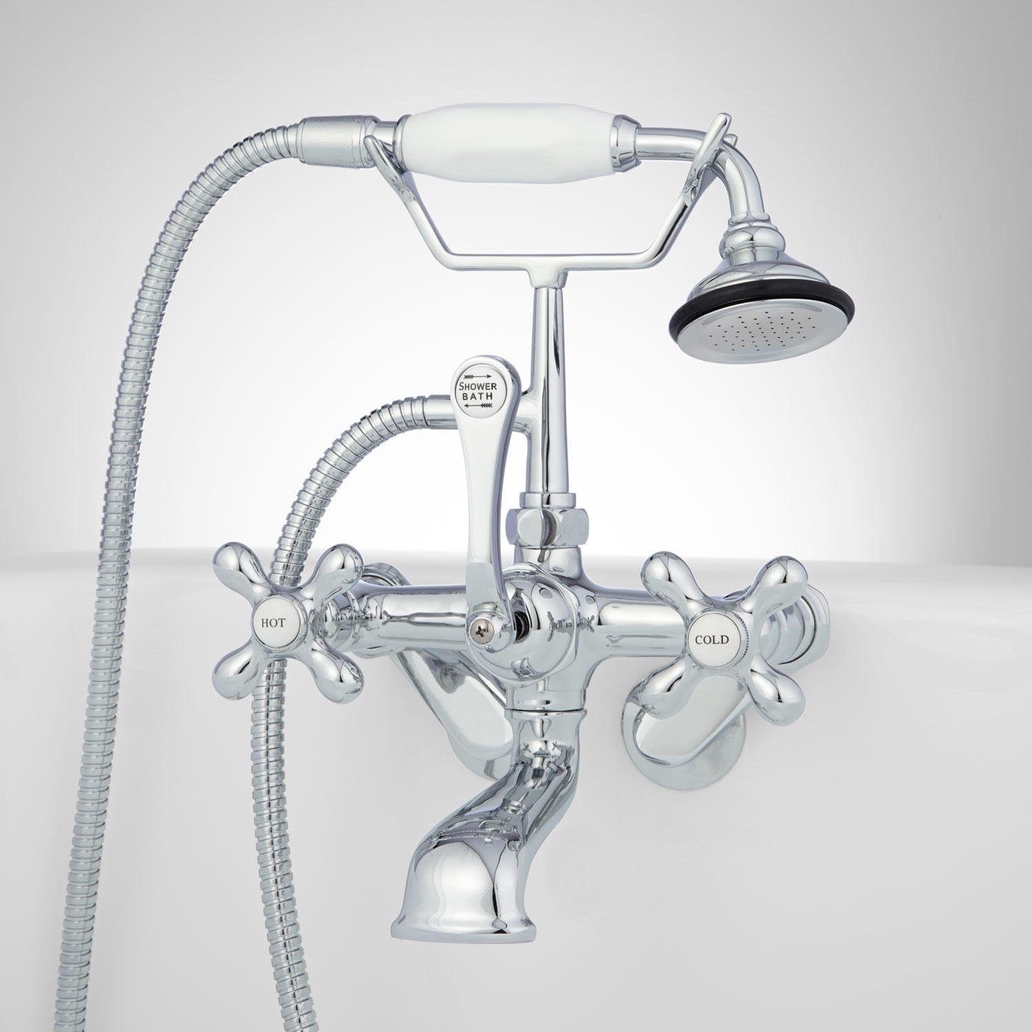 This elegant tub faucet includes a telephone-style hand shower on a long hose for easily washing hair or hard-to-reach areas of the tub. Signature Hardware 900480 Features: Covered under Signature Hardware's 25 year limited warranty Solid brass construction Includes hand shower single function hand shower handy for rinsing down the tub or just rinsing off after a bath Widespread tub wall mounted installation - 2 hole faucet with 3-3/8" to 12-3/8" faucet centers 3 handles included with faucet Includes rough in valve Integrated diverter included - located on the tub spout All hardware required for installation is included Signature Hardware 900480 Specifications: Height: 12" (from bottom to top of faucet) Spout Reach: 7-1/4" (center of faucet body to center of spout outlet) Hand Shower Flow Rate: 1.8 gallons-per-minute Hose Length: 60" Maximum Deck Thickness: 3/4" (Cannot mount on thicker decks without use of extension kit) 2 faucet holes required for installation Faucet Centers: 3-3/8" - 12-3/8" (center-to-center distance between handle installation holes)