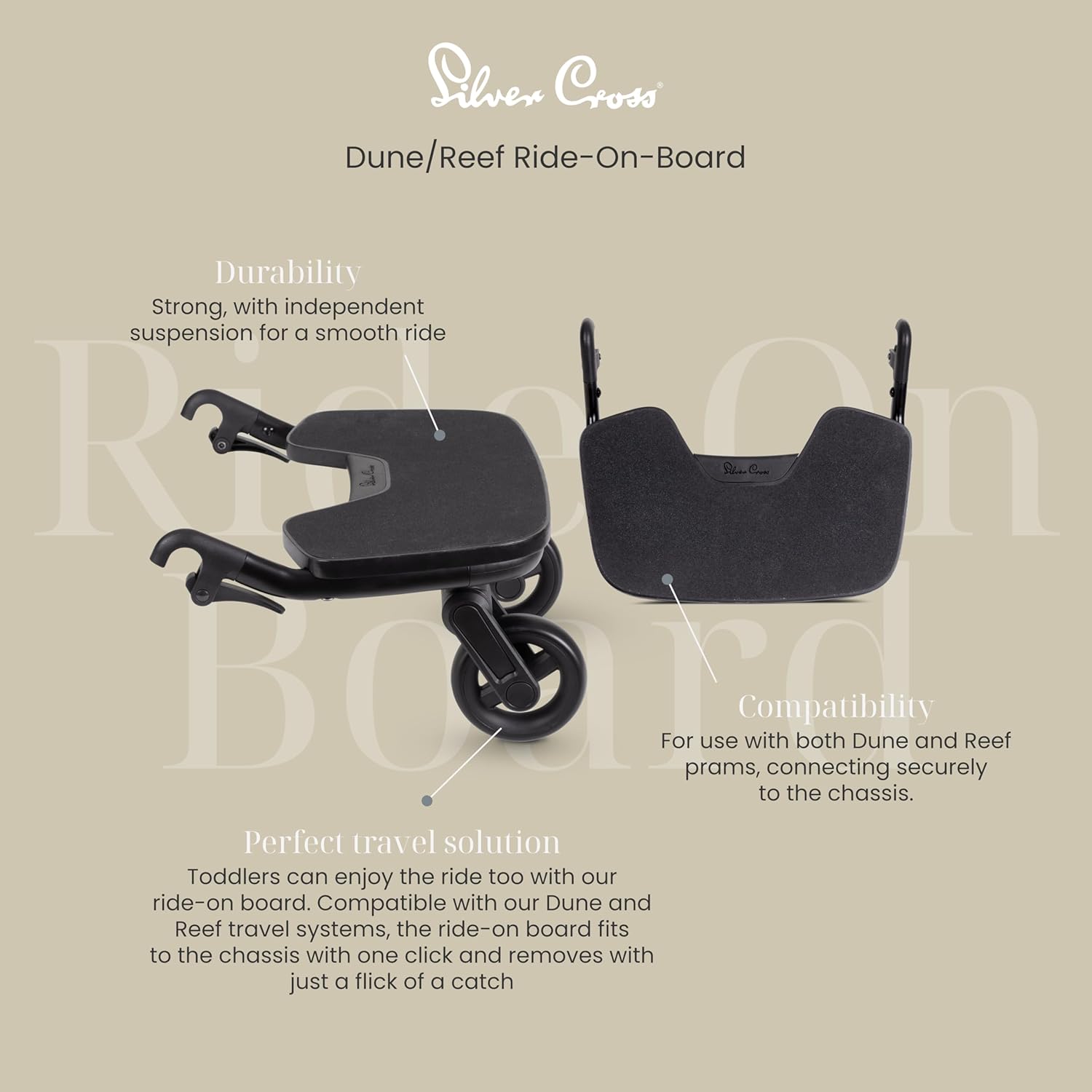 Toddlers can enjoy the ride too with our new Ride-On-Board. Compatible with our new Dune or Reef travel systems, the Ride-On-Board fits to the chassis with one click and removes with just a flick of a catch. Suitable up to approx. 4 years, the Ride-On-Board is perfect for tired toddler legs on longer walks. A handy strap lets you clip the Ride-On-Board to the basket when not in use.