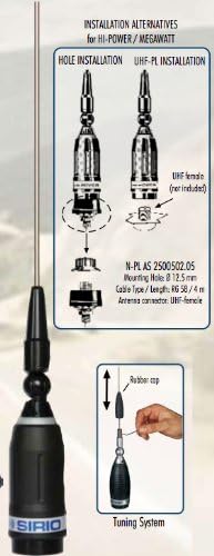 Vehicular antenna conceived to bear high powers. The coil is made of big section copper wire and the whip of conic 17/7PH stainless steel to get the best performance. The mount is of black chromed brass with a rubber washer for a perfect watertightness and its UHF-PL259 connection makes it suitable for the installation on magnetic mount. It can be supplied with "N-PL" mount and 4m cable for a hole installation on the vehicle.