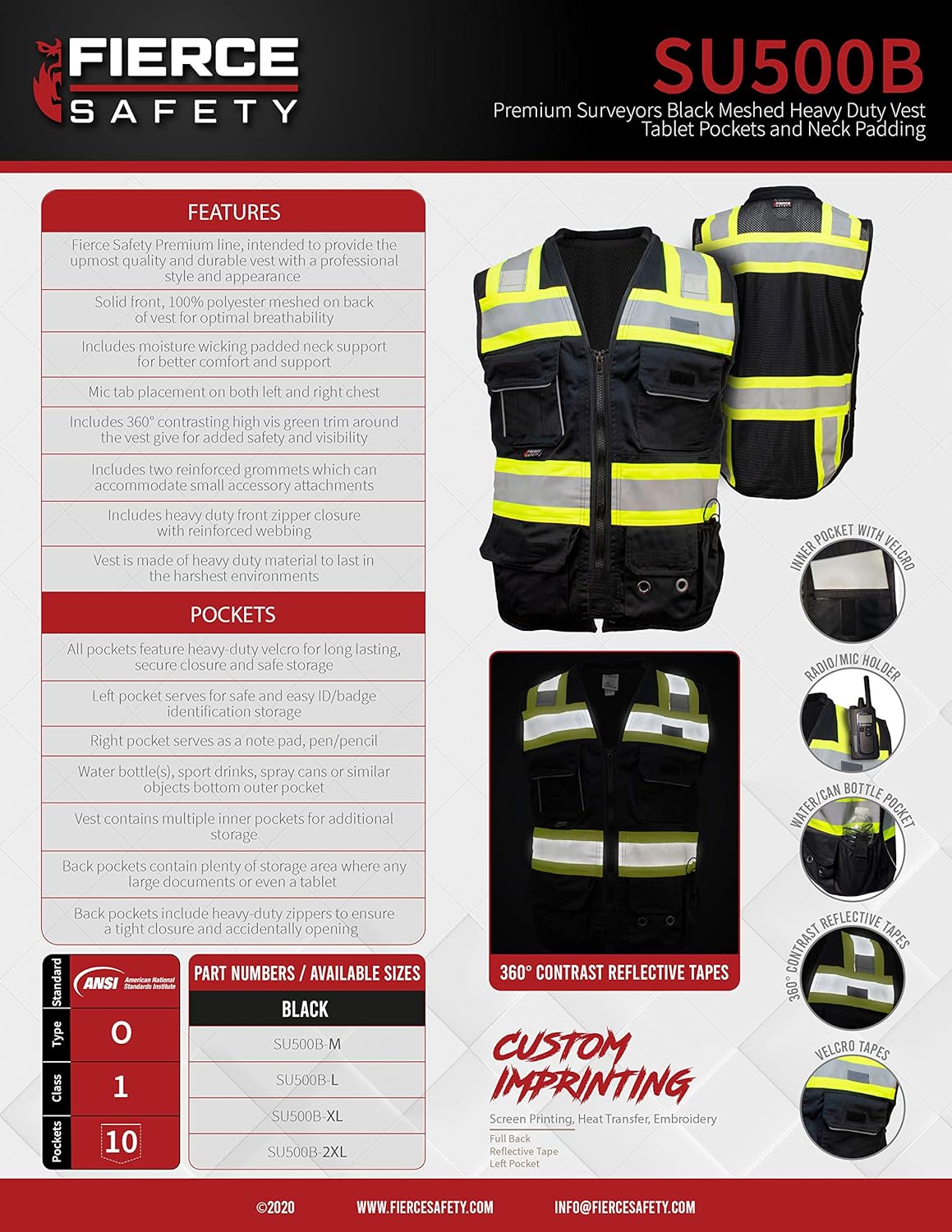 - The black vest vest with high vis reflective tape and green trim makes you standout elegantly and differentiate yourself amongst others, while still complying with ANSI Type 1 Standards! - Solid front, 100% polyester meshed vest on back of vest for optimal breathability - Includes moisture wicking neck support for better comfort and support - The added 360° contrasting reflective green trim around the vest give it a more visible, clean and more professional look - Includes two reinforced grommets can accommodate small accessory attachments - Includes easy mic tab placement on both left and right chest - Includes heavy duty front zipper closure with reinforced webbing, both on the front and the large side pockets - Size XL