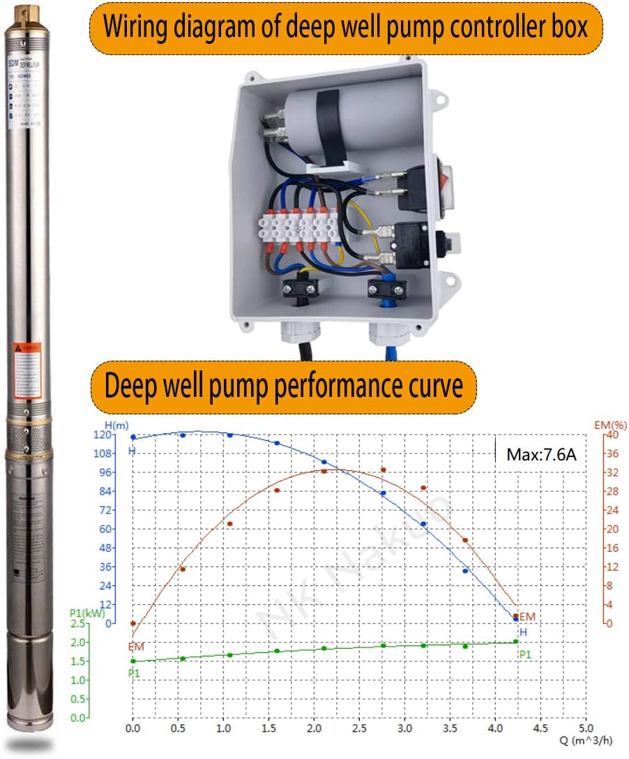 Specification: Model: 3SDM1.8/18-0.75KWV0 Voltage: 220-240V/60Hz Power: 0.75KW,1HP Max. head: 116m/380ft Max. flow rate: 3.6m³/h, 16GPM Speed: 3420r/min Outlet: 1 inch, OD Pipe: 3 inch Flat blue cable: 30m (98ft) Number of impeller: 18 Plug type: US plug Features:Shell, motor shaft are made with stainless steel to ensure corrosion resistance High quality sealed ball bearings guarantee its excellent performance High efficient thermal protection to prevent overheating, for longer life and powerful startHeavy-duty thermoplastic impellers, diffusers, and intake screenSubmersible design creates quiet operation Unique design reduces its noise This is a 3 wire pump (3 wires + ground wire) 98ft long electric cord includedThis pump model features a built in check valve, however this check valve is only used to prevent water from going back in the pump and causing backspin of the impellers Application: It is suitable for extraction from the deep wells for groundwater, and can also be used in rivers, reservoirs, canals and other water lifting works Mainly used in farmland irrigation and mountainous areas for human and animal using water, but also for draining in cities, factories, railways, minesPackage Include: 1 x Deep Well Pump 1 x Control Box 1 x Outlet 1 x Flat Blue Cable: 30m(98ft) 1 x User Manual