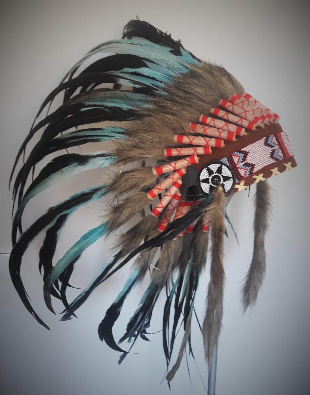 N55- Light Blue / Turquoise and dark Feather Headdress / Warbonnet. The World of Feathers Headdresses are the latest in fashion that deserves to be noticed. This elegant model resurrects the true meaning of a traditional headdress! this item gives off the spirit of what it means to be a loyal and brave warrior. Bring the natural and interesting side of you with this wonderful headdress product! This item is expertly crafted by hand and made from the finest materials in Indonesia. It radiates a ancestral influence that channels the inner you. The hat is constructed from real rooster or duck feathers with faux fur and durable and felt material. It’s paired with a multi-colored forehead band. Headdress size are: width: 43,3 inch hight: 19,7 inch ?The headdress that you will receive it is the photo with the man on it.